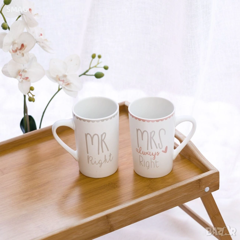 Комплект от две елегантни чаши – бяла основа с бежов дизайн за него и розов за нея, с надпис „Mr Right – Mrs Always Right“. Идеални за забавни и стилни моменти за двойки, кафе или чай.