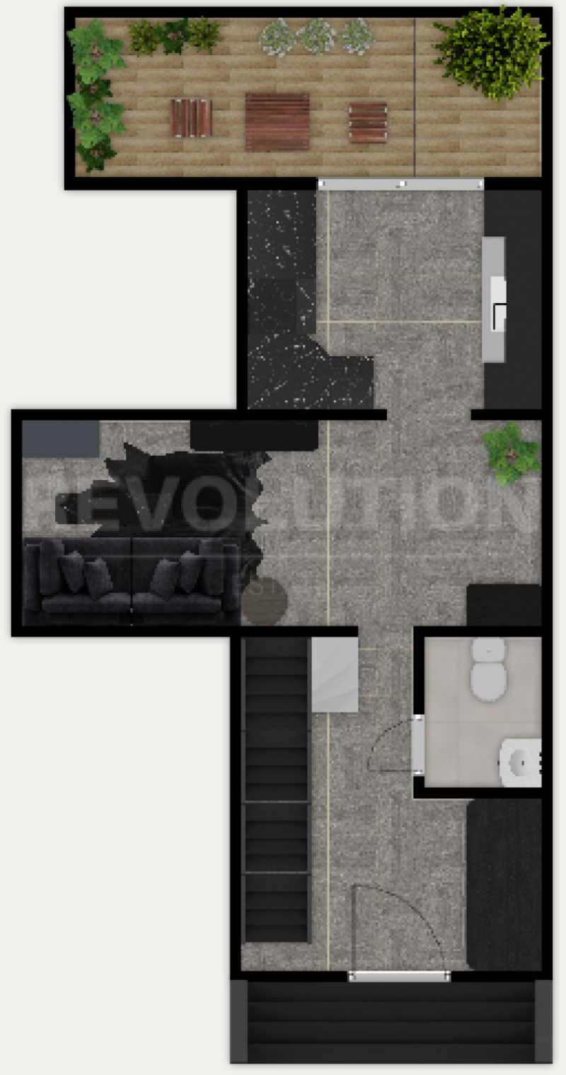 Втори етаж: спалня, баня с тоалетна, дрешник, офисно пространство и голяма тераса.