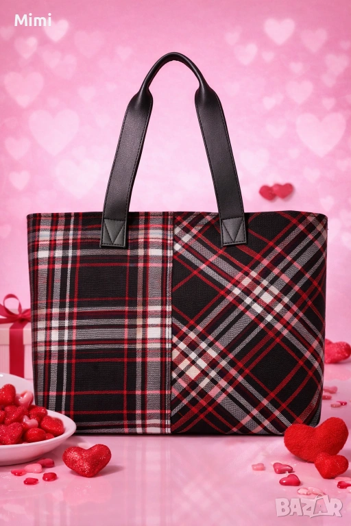 -Голяма тъмно червено карирана чанта, подходяща за сезона и ежедневието.. Украсена с шикозен златен метален монограм VS, .Закопчаване с цип в горната част,има и вътрешен джоб. Цена 30 размери 60цм Д x 34 см В x 19,9 см