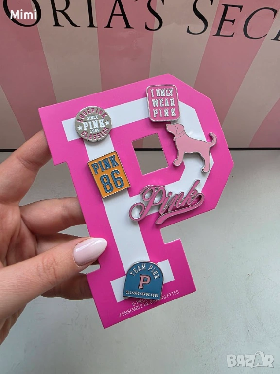 - PINK сет от брошки (6 бр) Закачи тези сладки брошки на чанта, яке, шапка или където пожелаеш .Част от класическата PINK колекция – 25 €