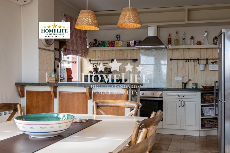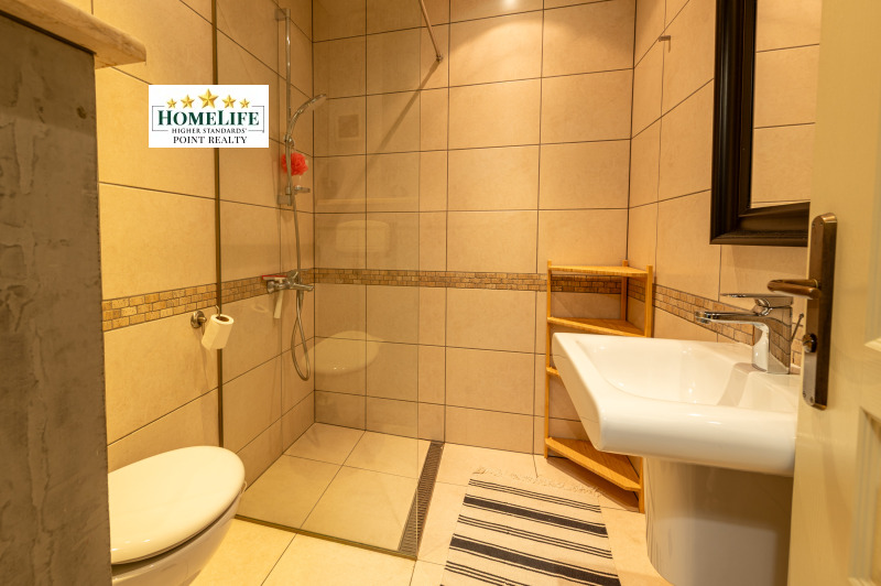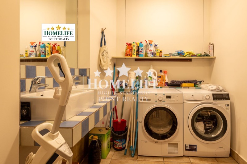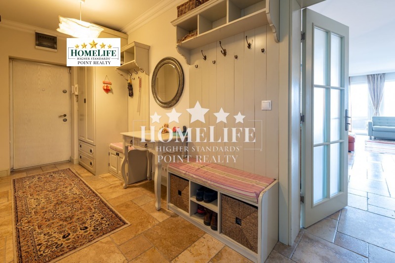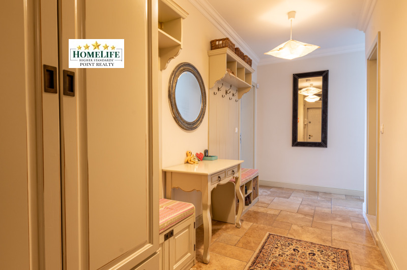 Входно антре, огромна дневна с излаз към тераса, отделна кухня с трапезария, три спални едната от които със собствен дрешник и баня, отделно втора баня, отделна тоалетна за гости, перално помещение.