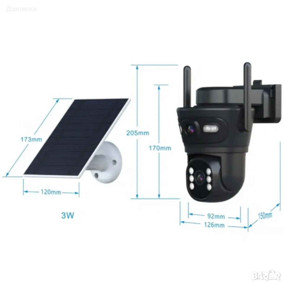 Технически характеристики на Соларна двойна камера LYLU 10 диода - ICsee Тип: Двойна соларна камера с Wi‑Fi Резолюция: 2 x 12MP Подсветка: 10 диода (LED/IR) — нощно виждане до 30 m Размери: камера 170×126×92 мм, соларен панел 173×120 мм Захранване: Соларен панел + вградена батерия, съвместима за автономна работа Свързаност: Wi‑Fi 2.4 GHz, управление през приложението ICsee Запис: MicroSD карта до 128 GB Защита: IP66 — прахо- и водоустойчива конструкция Допълнително: Поддръжка на push известия при движение, дистанционно гледане и управление, интеграция за външен монтаж