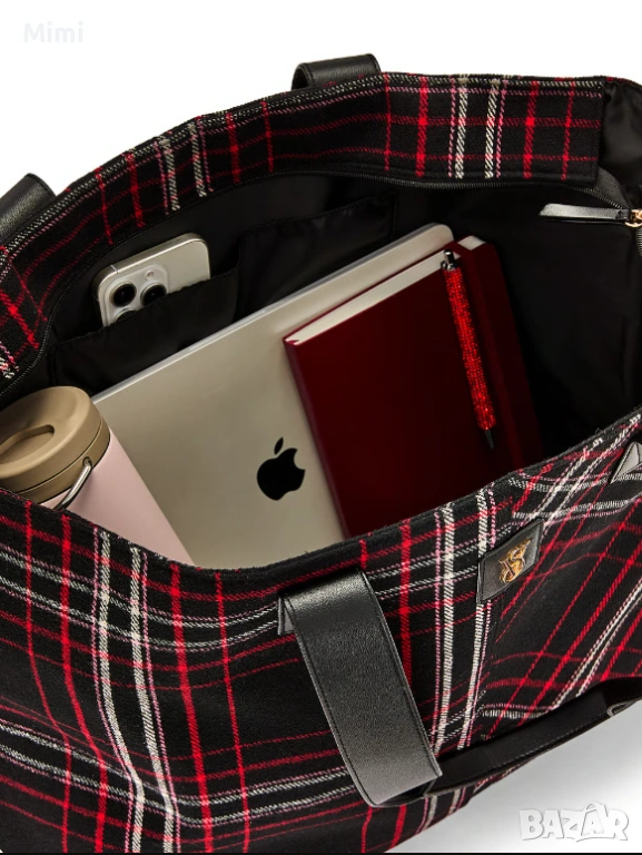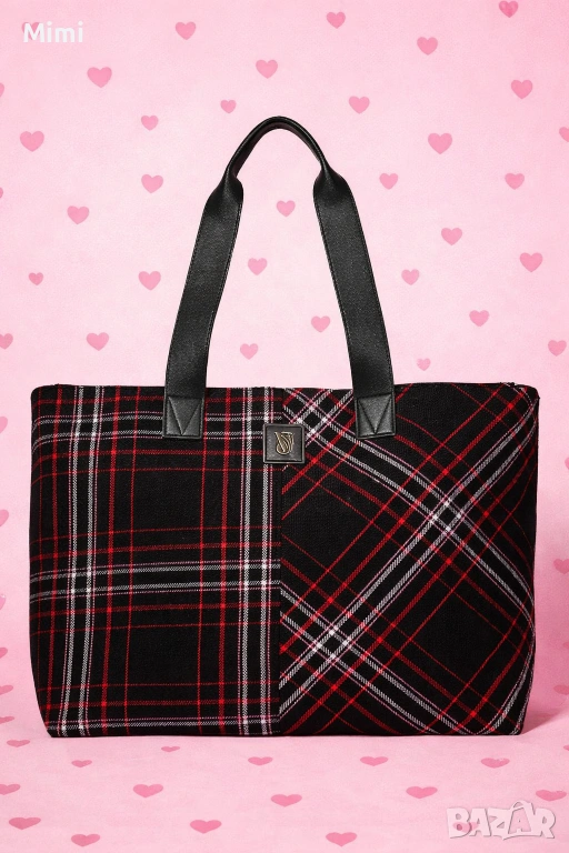 -Голяма тъмно червено карирана чанта, подходяща за сезона и ежедневието.. Украсена с шикозен златен метален монограм VS, .Закопчаване с цип в горната част,има и вътрешен джоб. Цена 30 размери 60цм Д x 34 см В x 19,9 см