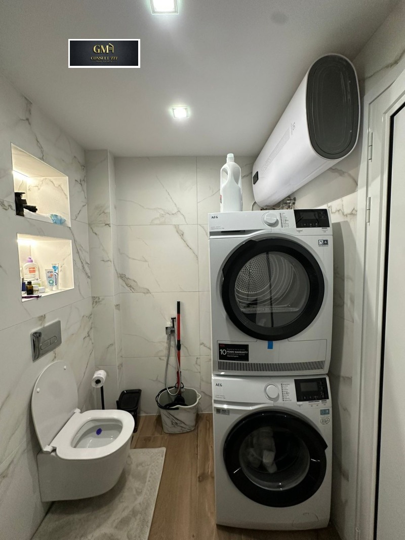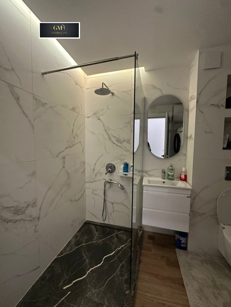Банята с тоалетна е завършена с луксозни облицовки, модерна санитария и стилни детайли, които подчертават високия клас на изпълнение. Подовите настилки в целия апартамент са качествени и създават усещане за завършеност и комфорт.