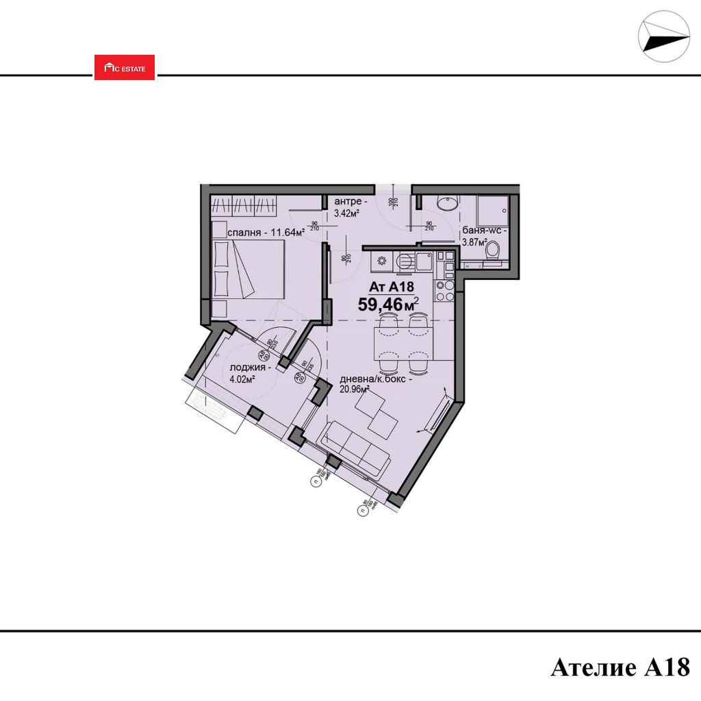Двустаен апартамент със статут на Ателие: ЗП 53 кв. м, разпределени като: дневна с трапезария и кухненски бокс, спалня, баня с тоалетна, склад. Изл. З, Отопление: ГАЗ