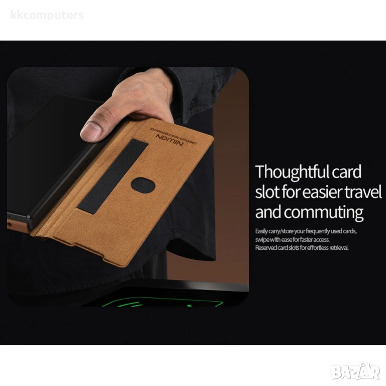 Моделът разполага с практични отделения за карти, както и с подвижен държач за стилус. В комплекта е включен стилус, което позволява пълноценно използване на устройството без необходимост от допълнителни аксесоари.