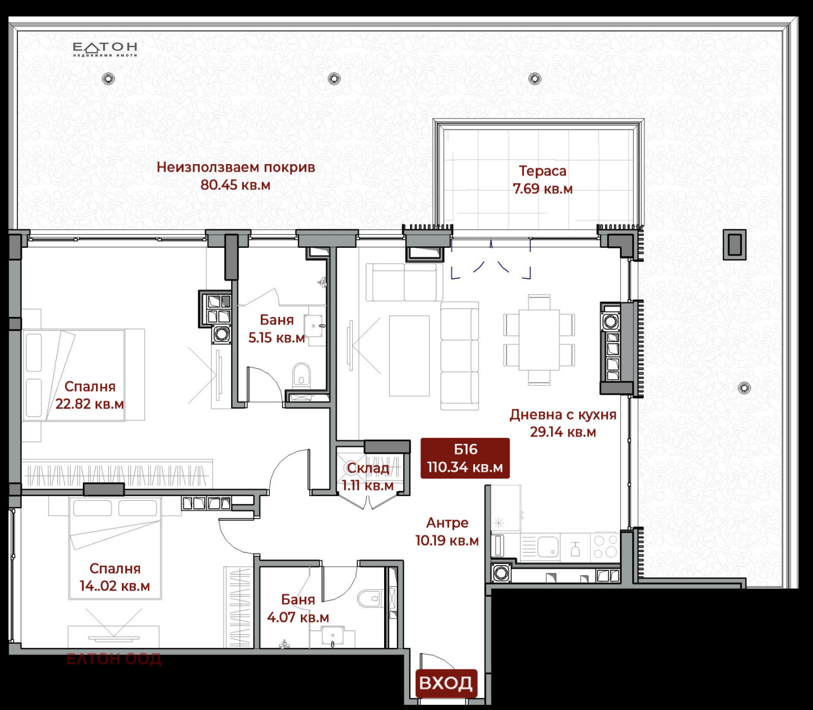 Апартаментът има прекрасни тераси с гледка към София, Витоша и Копитото. Състои се от две спални, две бани с тоалетни и дневна с трапезария и кухненски бокс. Застроената площ е 110 кв.м. към апартамента има панорамна тераса с площ 80 кв.м., която не е включена в посочената площ. Отоплението е предвидено на газ, трябва само да се монтира газово котле.