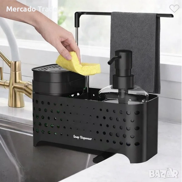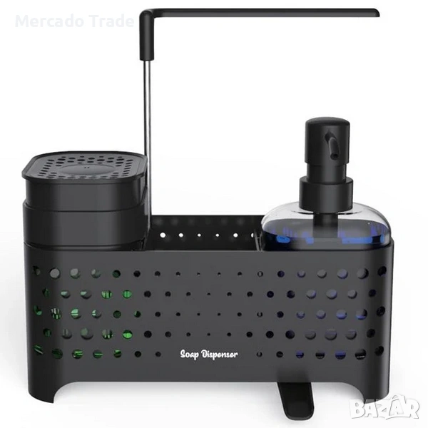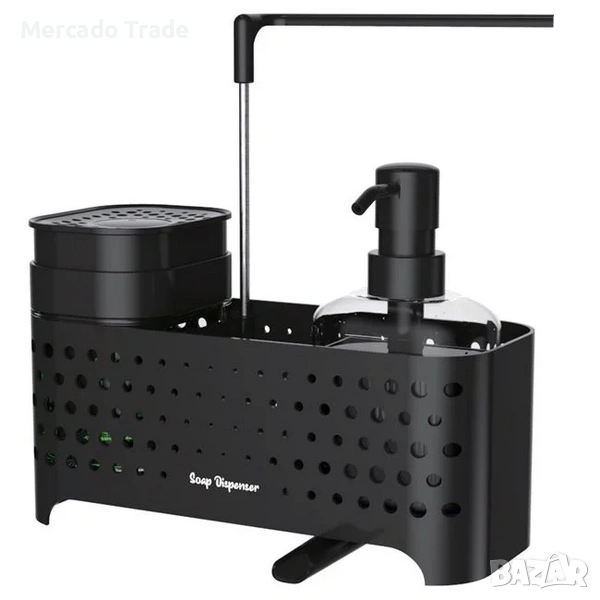 Пластмасов черен перфориран органайзер за мивка. Разполага с отделение и контейнер с дозатор за препарат за съдове, място за кърпа и гъби, както и лост за сушене на почистващите кърпи. Има допълнителен контейнер за течен сапун с капак и помпа, който с едно движение – чрез леко притискане на гъбата отгоре – освобождава малко количество сапун. В долната част е предвиден отвор за оттичане на водата, който спомага за по-бързото изсъхване.