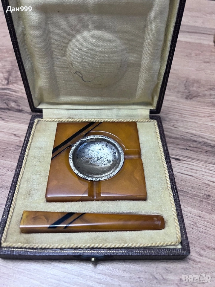 Продавам винтидж луксозен подаръчен комплект за пушач - цигаре и пепелник в оригиналната си кутия стил Арт Деко от периода преди втората световна 1928 - 1935 год. Изработени във Париж Франция от кехлибарен бакелит много стилни и красиви в отлично запазено състояние . Вероятно единствен в България .