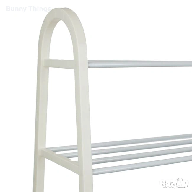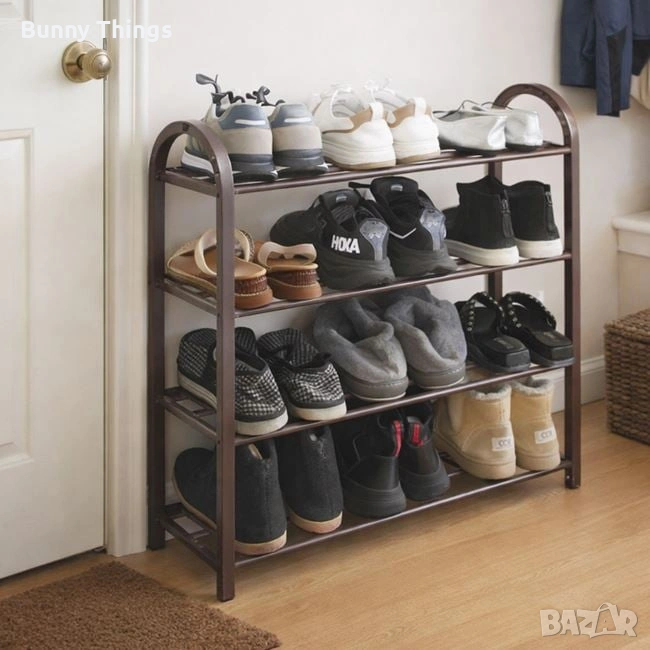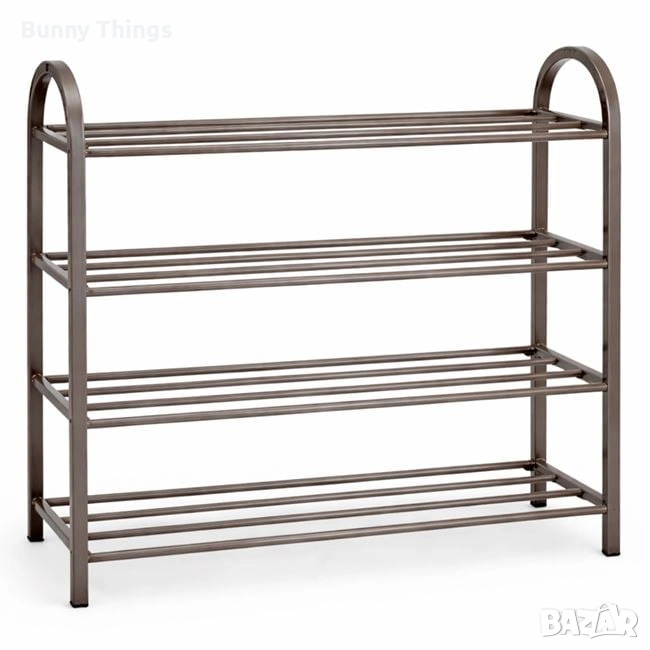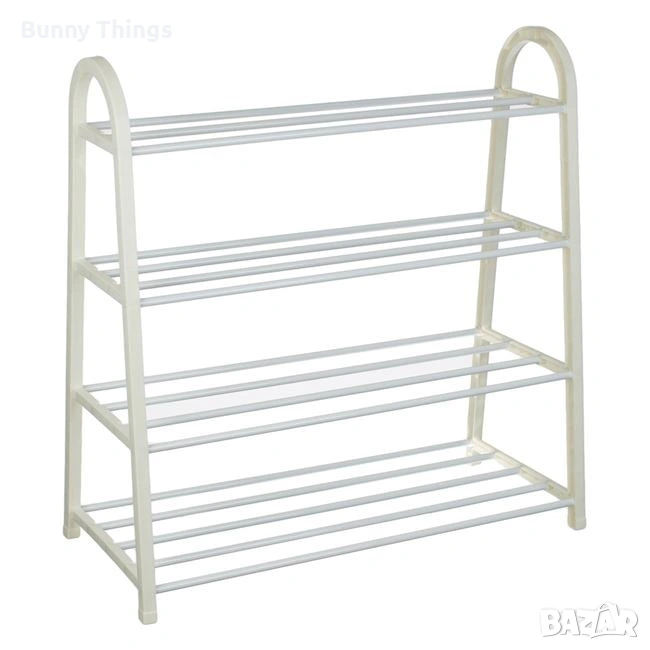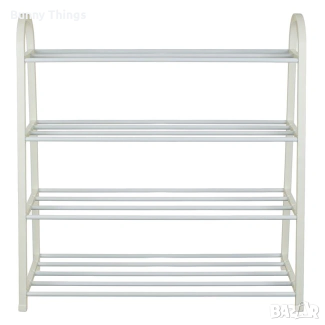 Етажерка за обувки с 4 рафта, изработена от метални тръби, лесна за сглобяване и изключително практична. Рафтовете са с постепенно намаляваща ширина (26 / 23 / 19 / 16 см), което позволява удобно подреждане както на обувки за възрастни, така и на детски обувки. Побира минимум по 3 чифта обувки на рафт, като помага за по-добрата организация и подредба на пространството. Височината на всеки рафт е 16,5 см. Краката са снабдени с предпазни тапи, които защитават пода от надраскване и други повреди.