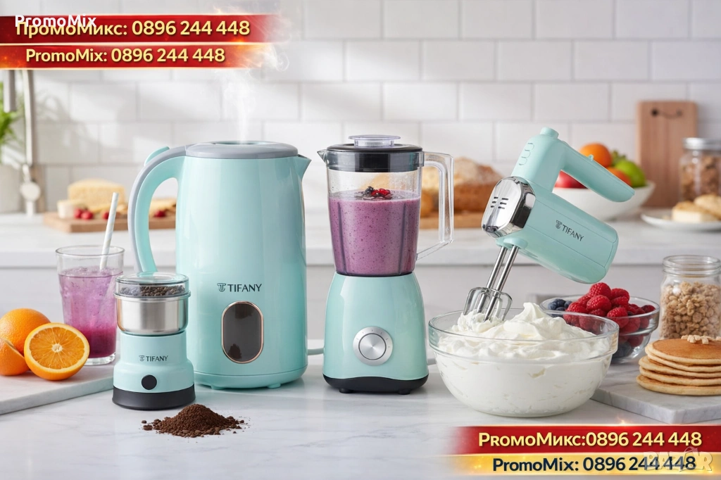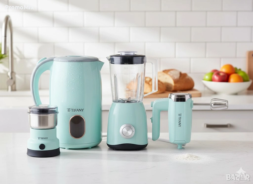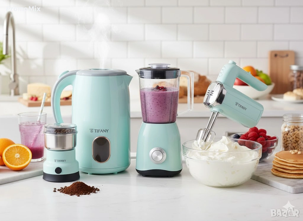 Tiffany TF777 е комплект включващ 4 уреда - блендер, ел. кана за топла вода, миксер и мелничка за кафе, ядки, семена и др.