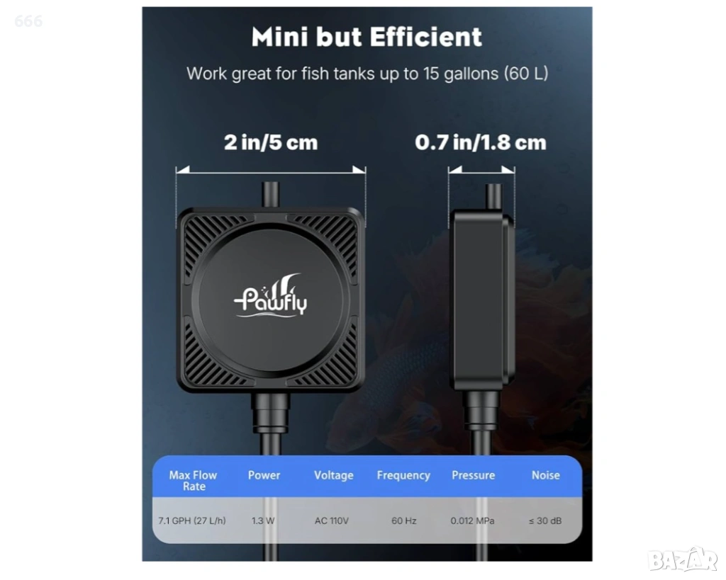 Мини, но ефективна: Размер: 5 x 5 x 1,8 см (Д x Ш x В); Максимален въздушен поток: 7,1 GPH (27 л/ч); Мощност: 1,3 W. Помпата за аквариумно въздух осигурява оптимално насищане с кислород за аквариуми до 60 л, създавайки процъфтяващ подводен рай за риби и растения.