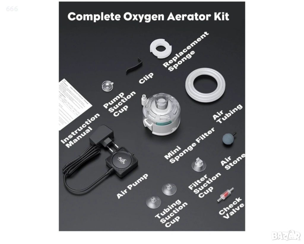 Пълен комплект за кислороден аератор: Включено е всичко необходимо – въздушен камък за фини мехурчета, предпазен възвратен клапан, въздушен маркуч за нежно насищане с кислород и 3 допълнителни вендузи за закрепване на филтъра или въздушния маркуч. Просто го включете за незабавна поддръжка на аквариума.