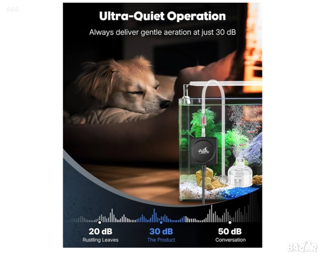 Ултратиха работа: Захранвана от тънка пиезоелектрическа керамична плоча, помпата за аквариумно въздух осигурява нежна аерация само с 30 dB. Почти тиха като шепот! Идеална за спални, офиси, кабинети и други пространства, където тишината е важна.