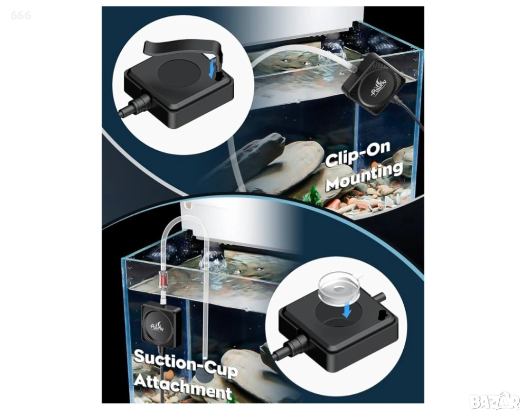 Два метода за монтаж: Насладете се на бърз и сигурен монтаж върху аквариуми с всякакви форми! Прикрепете мини въздушната помпа към ръба на аквариума с помощта на черната щипка или я прикрепете от външната страна на аквариума с помощта на двустранната вендуза. Не са необходими допълнителни инструменти.