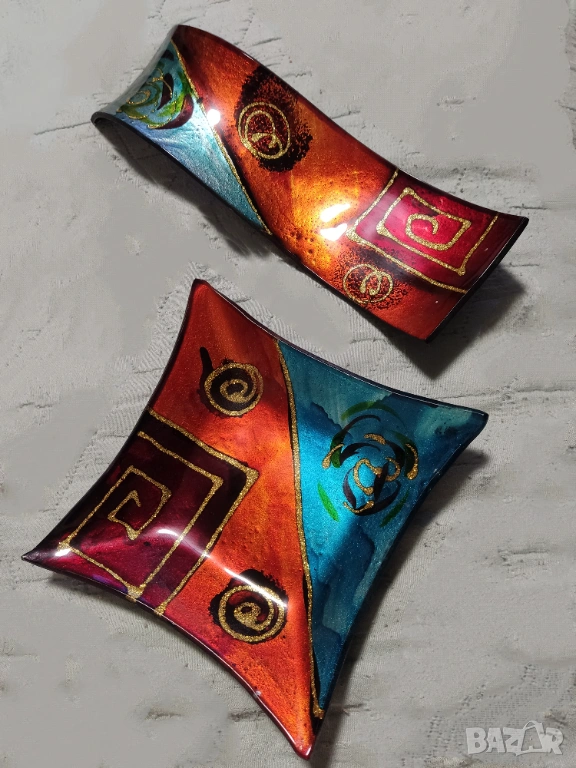 Уникална колекция от Ръчно изработено топено стъкло с гланцово емайлирано покритие от една серия. Испанска марка за художествено стъкло La Palma. Направени са с техника на топено стъкло, при която различни парчета цветно стъкло се разтапят заедно в пещ, за да се образуват уникални форми и дизайни.