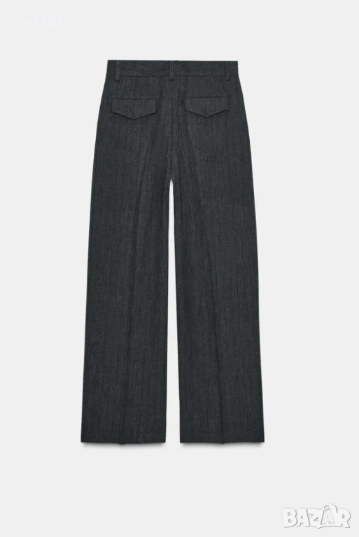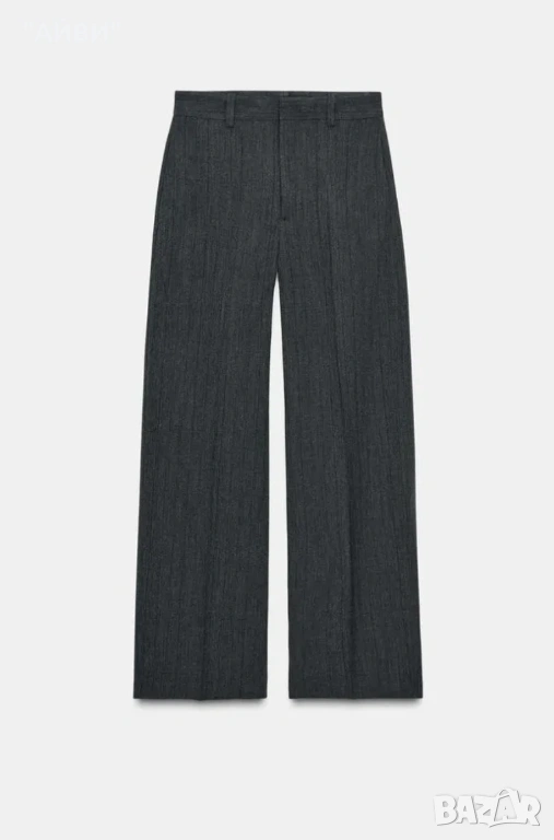 Текстуриран анталон с широка кройка, със средна талия с гайки за колан, странични джобове, задни с капак и пресовани ръбове отпред. Закопчаване с цип отпред, копче и метална кукичка.