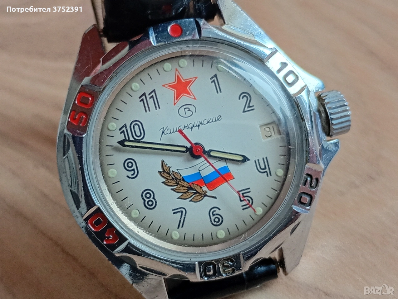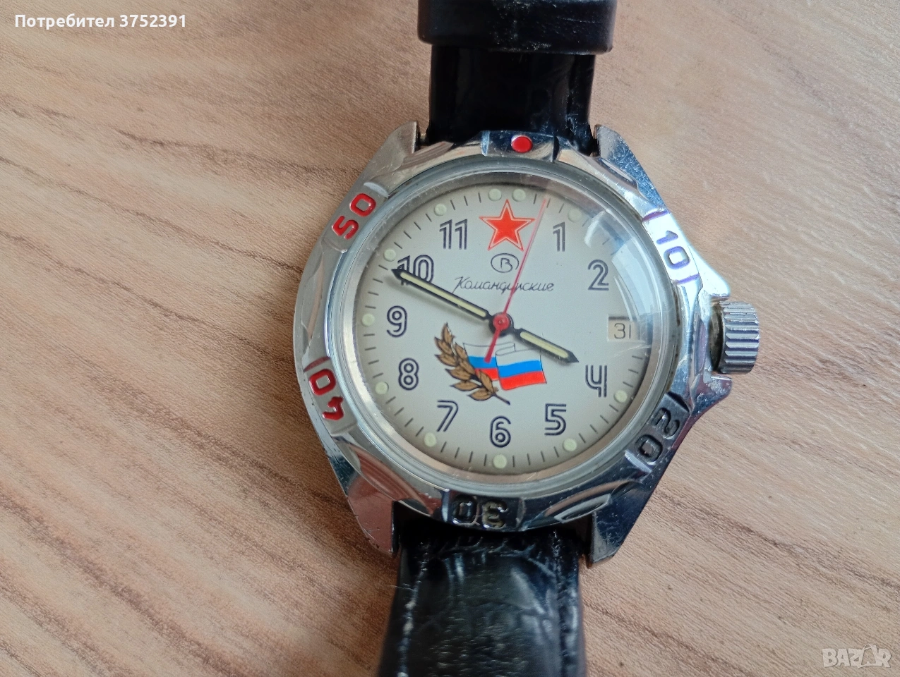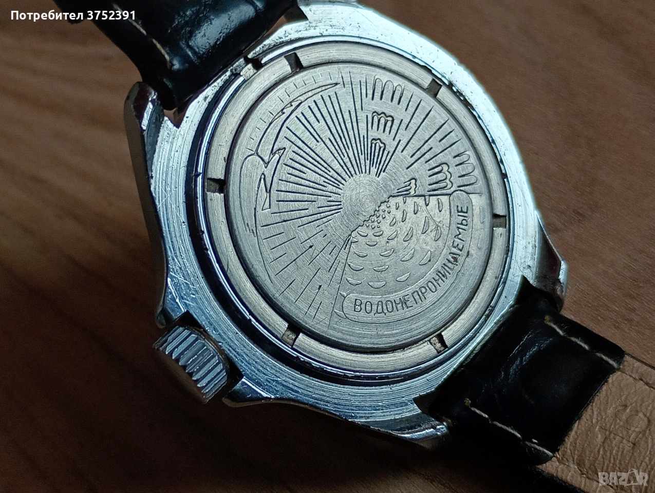 ВОСТОК Командирски, 17 камъка- изключителен часовник!. Размер на корпуса - диаметър 40,0 мм, без коронката. Здрав и надежден часовник, командирската машина. Външния вид на часовника се вижда на снимките, така, че ще опиша по-подробно машината - Кал. 2414 В, ръчно навиване, т. нар. "командирска" със 17 рубинови камъка, противоударен баланс /амортисьор на оста/; много безотказна и мн. надеждна; вибрации на баланса 19800/час; запас на хода - около 34-35 часа. Стандартната честота на вибрациите на баланса при винтидж часовниците е 18000/ч. Колкото по-високи са вибрациите на баланса, толкова по-малко се влияе точността на часовника от движението на ръката. Часовника е 100% автентичен!