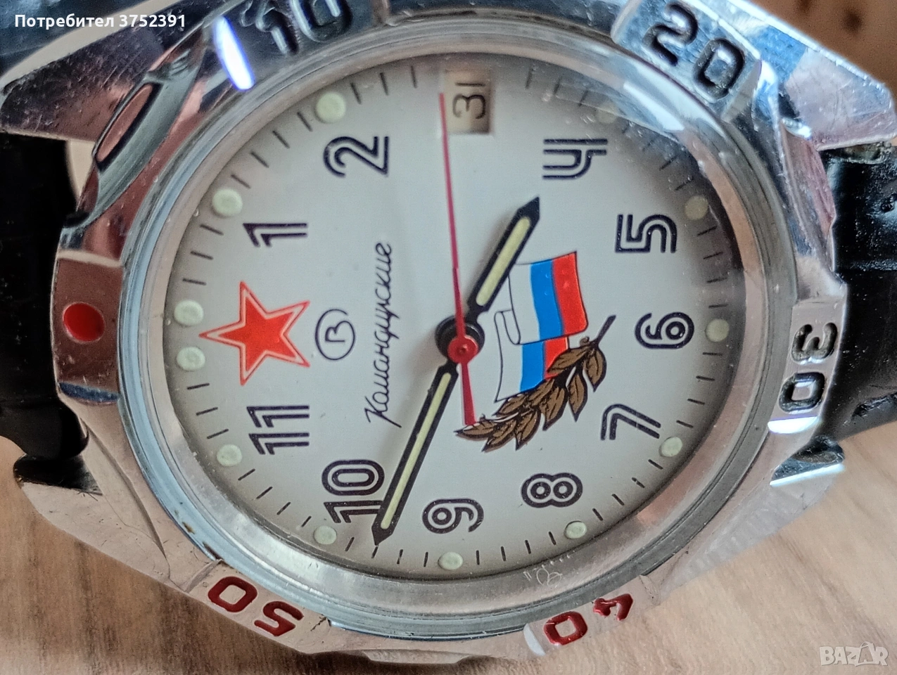 минимални следи от носене. надпис Командирские - /; каса, машина, стрелки, индекси , надписи - моля, разгледайте подробно снимките! Капак на корпуса - на винт; корнка - на винт; часовникът е с мн. добра херметизация. Прозрачен капак на корпуса! Поддържа отлично време за механичен часовник - до +30-45sec/ 24 h.