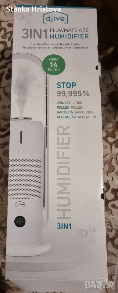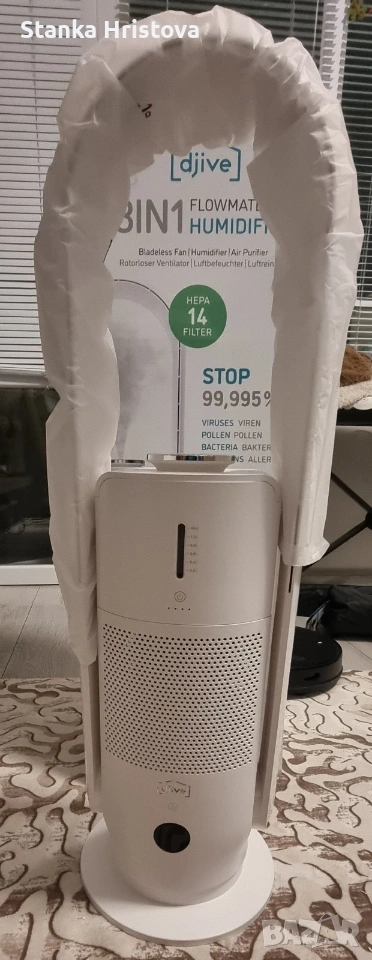 Продавам Работещ Чисто нов Djive Flowmate ARC 3 в 1 - Пречествател, Овлажнител и вентилатор. Изключително тих – под 30 dB, подходящ за спалня или офис.