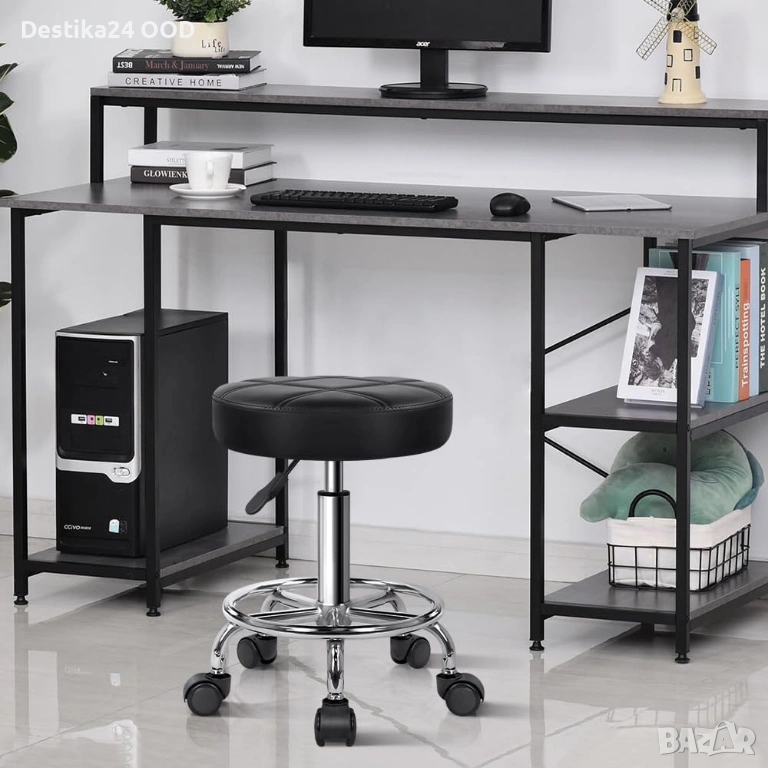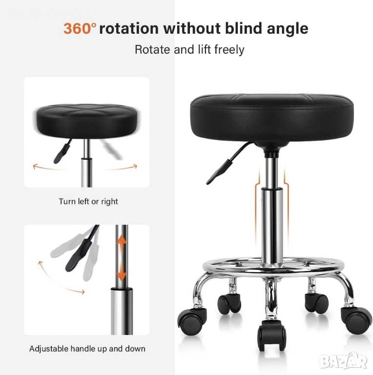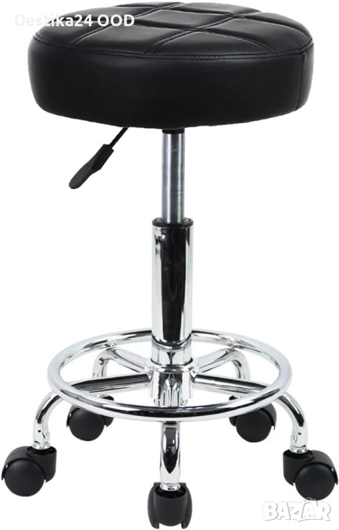 Столът е с мека и широка седалка от PU еко кожа, устойчива на вода и масла, лесна за почистване и поддръжка. Регулируемата височина се настройва плавно чрез хидравличен механизъм, а 360° въртене осигурява максимално удобство при работа.