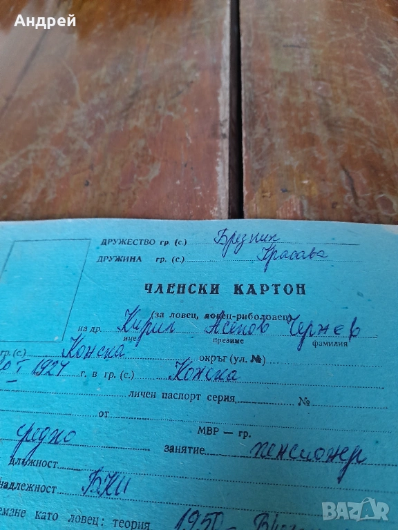 Стар членски картон на ловец,риболовец, снимка 1 - Други ценни предмети - 53418036 Стар членски картон на ловец,риболовец, снимка 2 - Други ценни предмети - 53418036 Стар членски картон на ловец,риболовец, снимка 3 - Други ценни предмети - 53418036 1/3