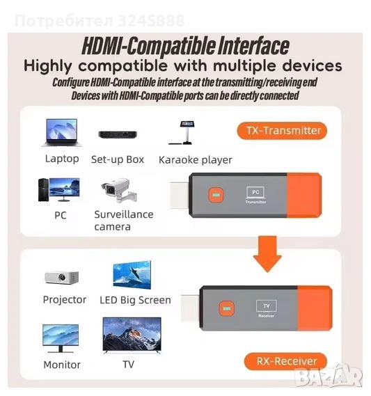 Нов HDMI безжичният предавател предава аудио и видео сигнали с HD висока резолюция 1080р чрез собствена своя 5G WiFi мрежа, а видеоклипове с висока разделителна способност от компютри или други мобилни устройства се предават чрез това WiFi на друг екран - телевизор, монитор или видео проектор на разстояние 30 метра. Основни характеристики: