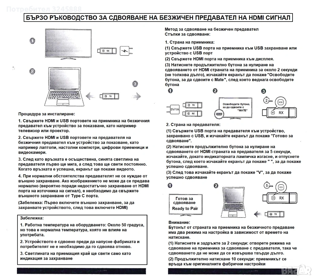 4.Свържете предавателя към компютър или друго устройство за подаване на видео сигнал HD. След като светодиода - индикаторната светлина влезе във флаш състояние, изчакайте повече от 10 секунди да завърши процедурата.