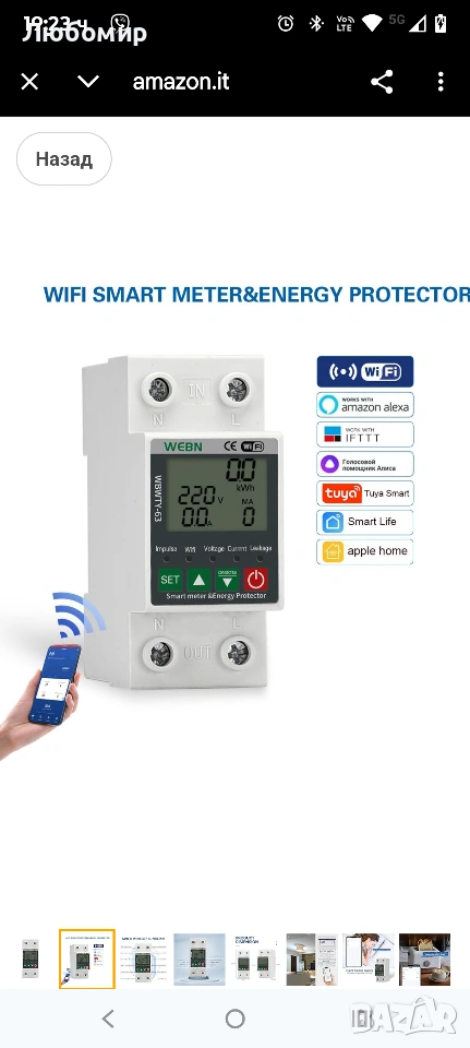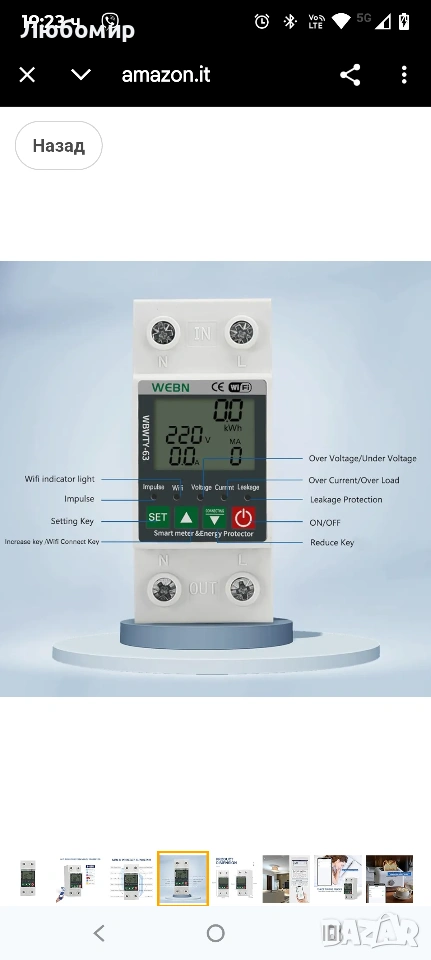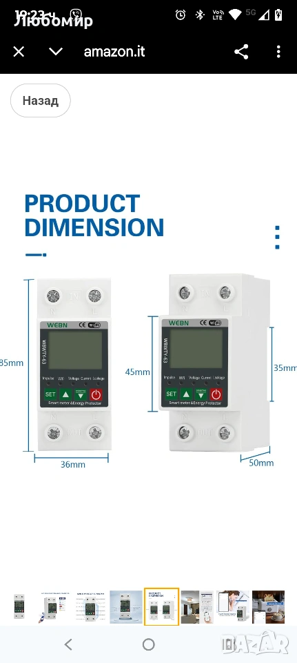 -230VAC, 63A, LCD дисплей за реално напрежение, реален ток и обща консумация на енергия. Само 2 модула, място за монтаж върху електрическа кутия, 35 мм DIN шина.