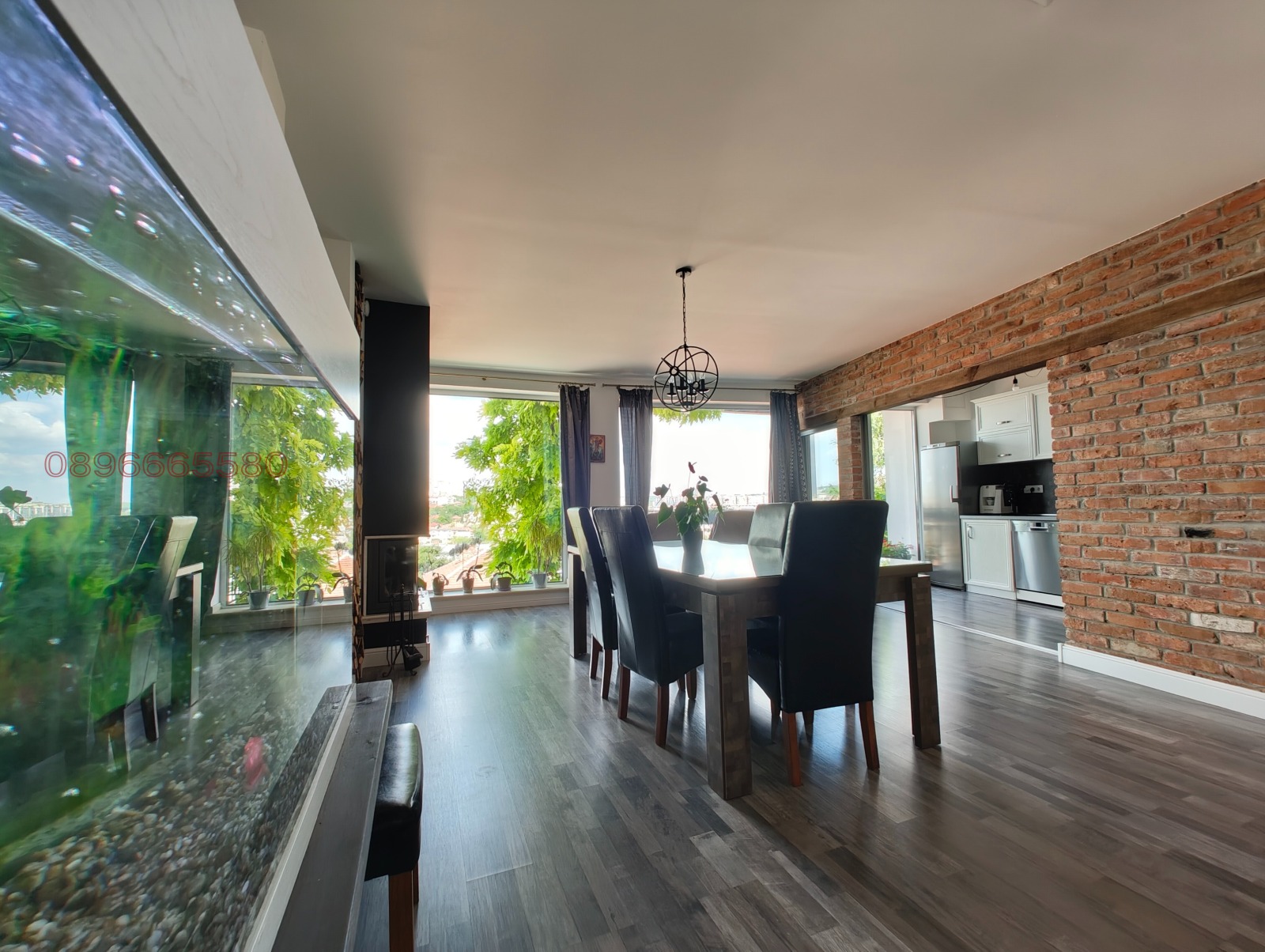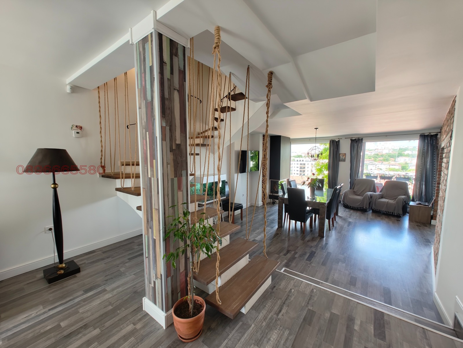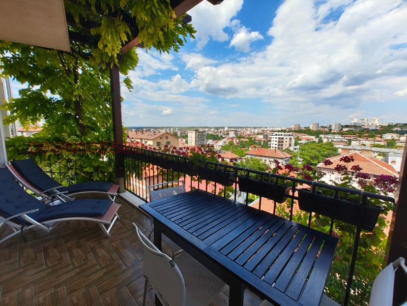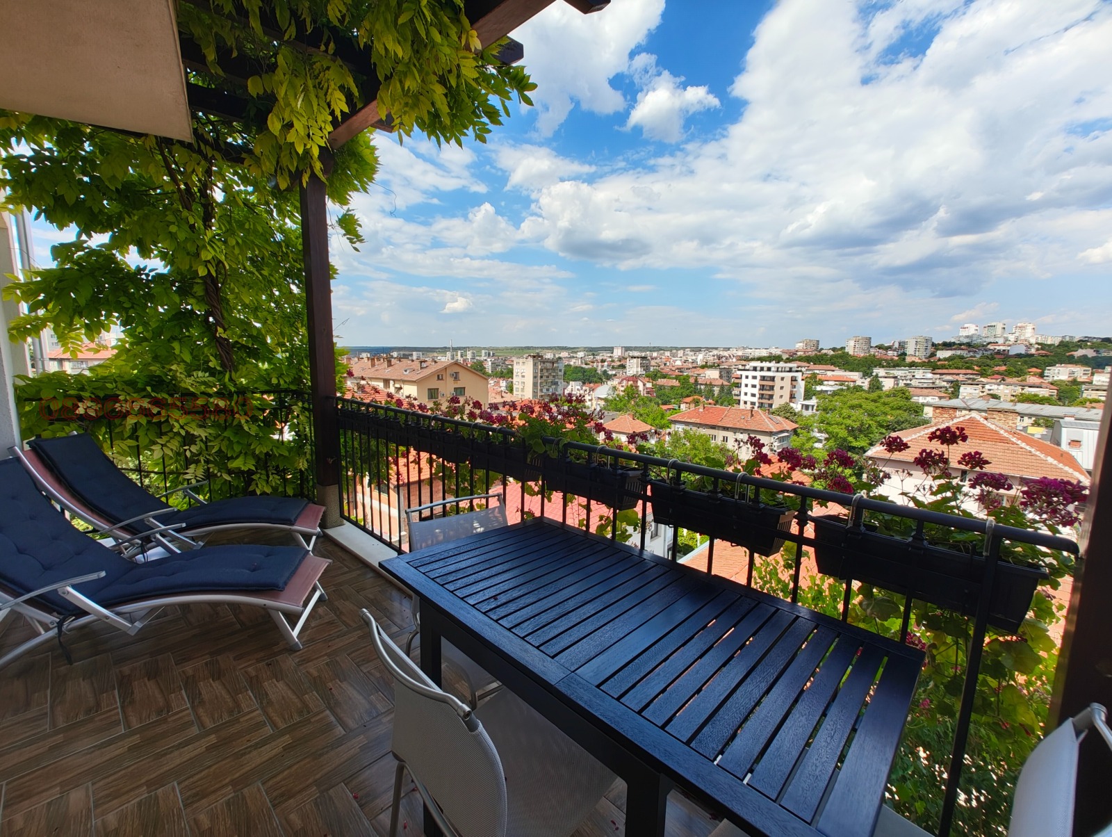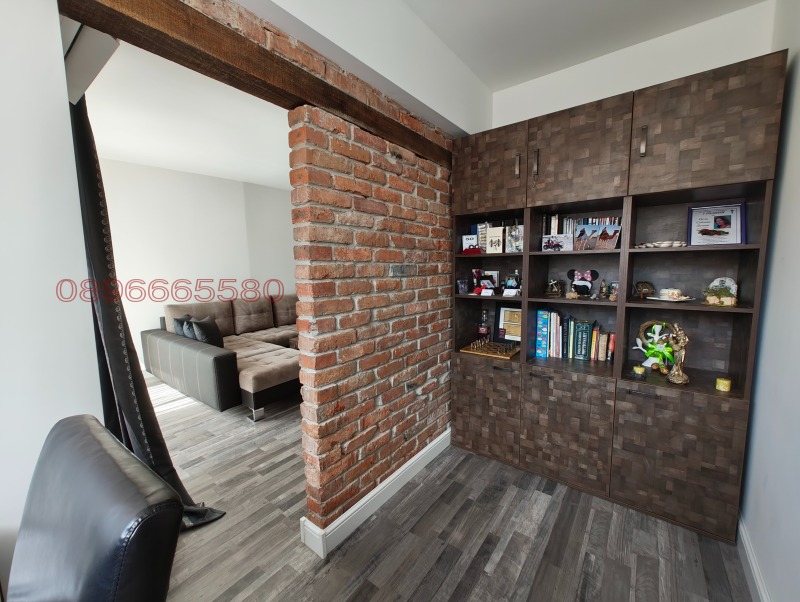 - 1- етаж от 105 кв.м - вход ,дрешник ,санитарен възел, кабинет , кухня с трапезария и хол с френски прозорци и голяма тераса 12 кв.м с панорамна гледка към града.