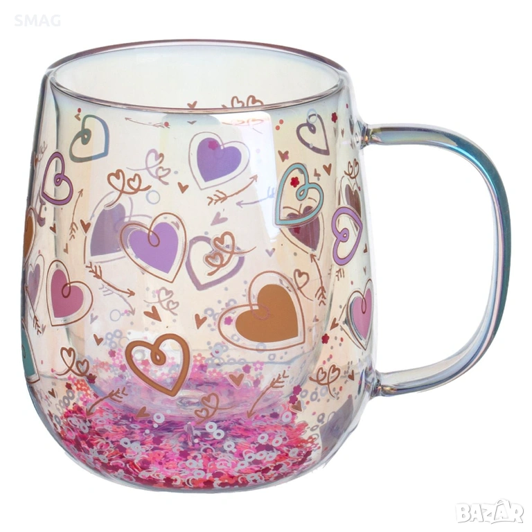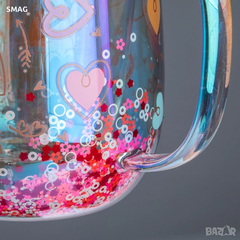 Елегантна прозрачна двустенна стъклена чаша с декоративни неонови сърца и конфети в розово, червено и бяло. Двустенният дизайн спомага за по-добра термоизолация и запазване на температурата на напитката по-дълго, като същевременно предпазва ръцете от изгаряне. Перфектен избор за кафе, чай или любима топла напитка.