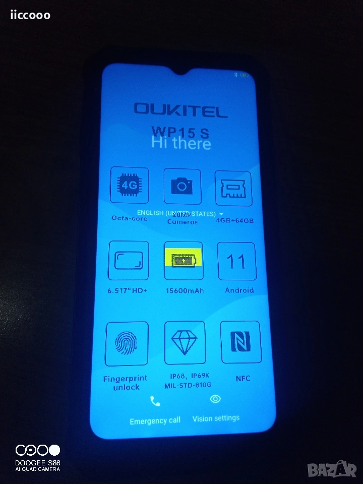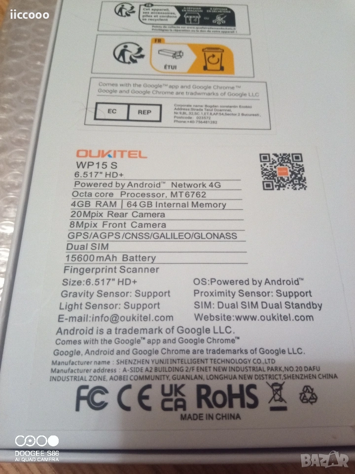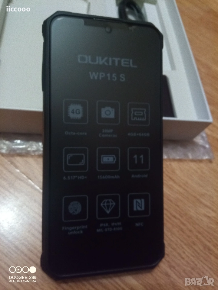 Oukitel WP15S е в състояние да издържи на почти всякакви екстремни условия на работа, има впечатляваща автономност и може да влезе в ролята на power bank или подводна камера. Този модел разполага с 6,52-инчов HD+ дисплей със съотношение на страните 18:9. За разлика от други телефони на пазара, които използват стъклени и керамични корпуси, Oukitel използва текстуриран заден панел от въглеродни влакна, който го прави нехлъзгащ се и устойчив на замърсяване. 15600mAh батерия Това, което отличава Oukitel WP15S, е огромната му 15600mAh батерия, която може да издържи четири или повече дни без презареждане. Телефонът може да действа и като външна батерия с функция за обратно зареждане. С едно пълно зареждане, тя ще издържи приблизително 1300 часа в режим на готовност или до 130 часа телефонни разговори. Благодарение на функцията за бързо зареждане с поддръжка на 18-ватово захранване, устройството попълва капацитета на батерията за 5 часа. Процесор и памет Телефонът има едночипова система MediaTek Helio P22, 4 GB RAM и 64 GB вътрешна флаш памет, която може да бъде разширена с карти памет с капацитет до 1 TB. Тъй като телефонът е предназначен за използване в тежки и екстремни външни условия, той е сертифициран по стандартите IP68/69K и MIL-STD-810G, което го прави водоустойчив, прахоустойчив и удароустойчив. Връзката с мобилна мрежа се осъществява чрез 4G, като се поддържа използването на две SIM карти или разширяване на паметта с помощта на microSD карта. NFC също е част от оборудването, както и бутон, който може да се настройва персонално. Камерата на гърба се състои от три обектива, основната камера разполага с 20, 2 и 0,3-мегапикселови сензори за изображения, а предната камера е 8-мегапикселова. Камерата на Oukitel WP15 S е оборудвана и с автофокус. Oukitel WP15S предлага страхотна производителност в повечето от основните си и развлекателни приложения. Смартфонът работи с Android 11 с потребителски интерфейс. ОСНОВНИ ХАРАКТЕРИСТИКИ Touchscreen Да Вид клавиатура IPS LCD capacitive touchscreen, 16M colors Честота мрежа Модел процесор 2G GSM :B2/3/5/8 3G WCDMA:B1/2/4/5/8 4G FDD:B1/B2/B3/B4/B5/B7/B8/B12/B17/B18/B19/B20/25/26/B28A/B28B/B66 MediaTek Helio P22 MT6762 4x Cortex•A53 2.0 GHz + 4x Cortex•A53 1.5 GHz Octa-Core Цвят Черен Размери мм 178.2 x 86 x 23.8 mm GPS Да Тегло (гр) 485 g ОS Android 11 Вид SIM карта Dual SIM (Nano-SIM, dual stand-by) ПАМЕТ Вътрешна памет 64 GB RAM памет 4 GB ДИСПЛЕЙ Резолюция (пиксели) 1920 x 1080 Брой цветове 16 М Диагонал на дисплея (инч) 6.52" Функции Sunlight display, Night display СВЪРЗВАНЕ GPRS Да Bluetooth 5.1 , A2DP, LE Wi-Fi Wi-Fi 802.11 a/b/g/n, Wi-Fi Direct, hotspot NFC - Портове Type-C ВИДЕО Резолюция на основна камера (Mp) 20MP+ 2MP + 0.3MP Sensor: IMX582 SONY Camera, O2M2032A Вградена светкавица Quad LED Вторична камера 8 MP Фото/видео характеристики Панорамен режим; HDR; Разпознаване на лица ; Фокус с докосване БАТЕРИЯ Тип батерия Вградена Li-Po 15600 mAh батерия; КОМУНИКАЦИЯ Съобщения Да Browsing HTML5 E-mail Да МУЛТИМЕДИЯ Видео запис Да Аудио запис Да ДРУГИ Сензори Пръстов отпечатък /отстрани монтиран/,акселерометър, жироскоп, сензор за близост,компас; Включени аксесоари USB кабел, зарядно Спецификации Телефони данни Процесор Octa-Core 4 x 2 GHz + 4 x 1.5 GHz Чипсет MediaTek Helio P22 (MT6762) 12nm Операционна система Android 11 Памет 64GB 4GB Дисплей 6,52'',16 M цвята,1080 x 2340 пиксела Камера 20MP+ 2MP + 0.3MP/8MP Батерия Li-Pol 15600 mAh