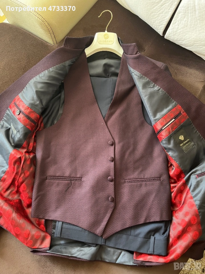 Костюмът е изключително запазен, без следи от износване, петна или дефекти. Стои много стилно и е готов за носене без нужда от корекции.