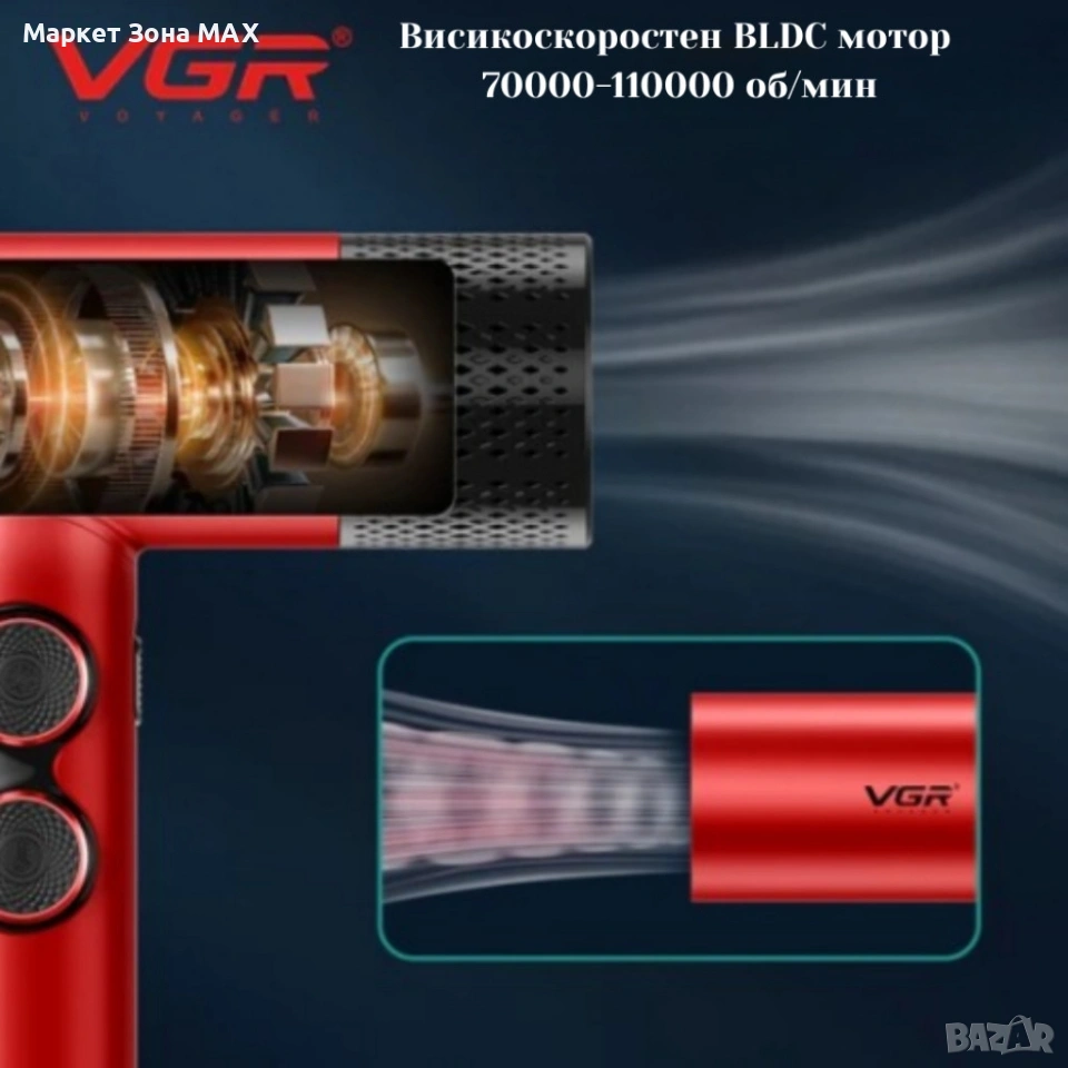 Сешоар VGR 401: BLDC мотор 1600–1900W, скорост 7000–11000 RPM, 40 температурни режима (60°–100°C), 40 скорости, дължина на кабела 2.3 m, тегло 396 g.