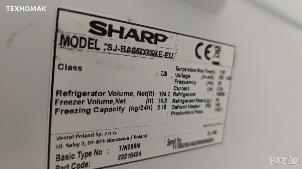 Хладилник с фризер SHARP височина 180 см. ширина 54см. дълбочина 60см. → Обява 53419544