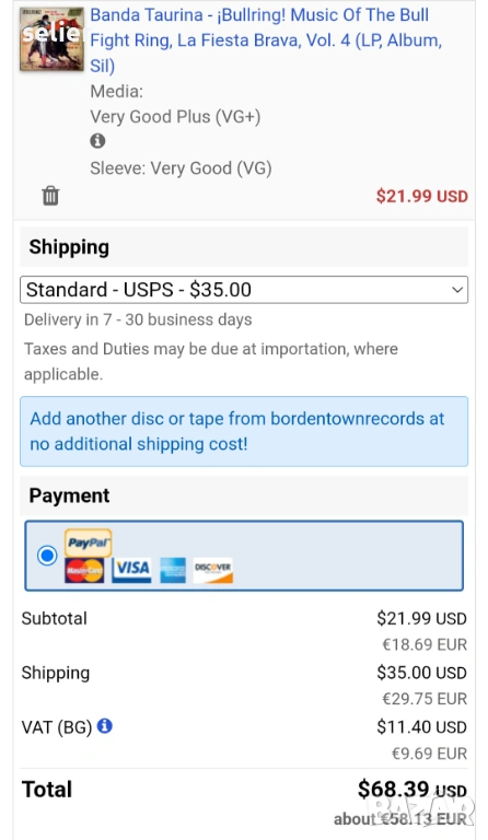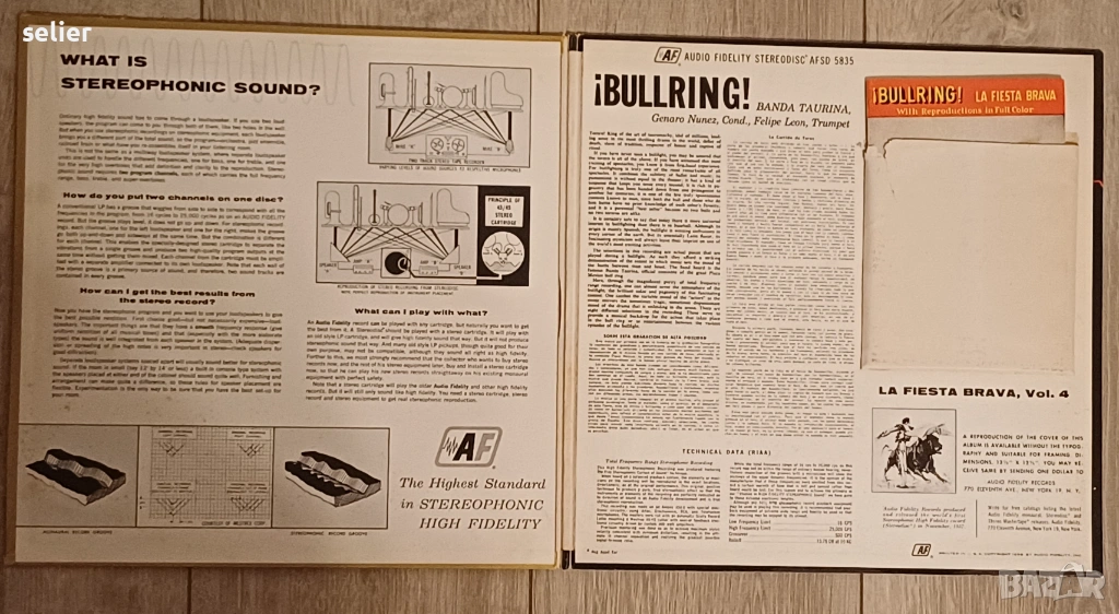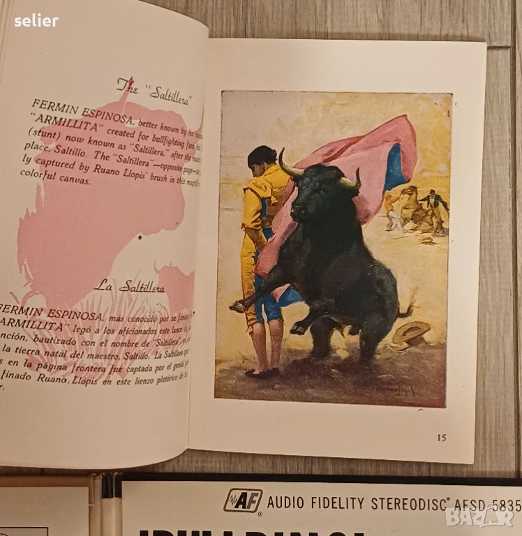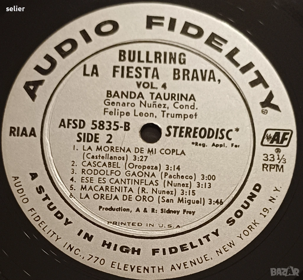 Виниловата плоча „¡Bullring! Music of the Bull Fight Ring, La Fiesta Brava, Vol. 4“, издадена от лейбъла Audio Fidelity (каталожен номер AFSD 5835) през 1958 г..