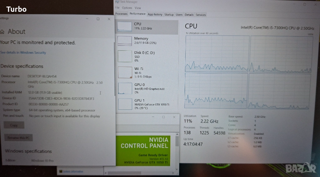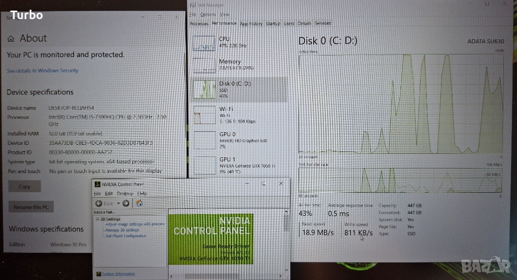 Видеокарти: NVIDIA GeForce GTX 1050TI 4GB GDDR5 и вградена Intel UHD Graphics 630 със споделена памет. Общ капацитет до 8GB.