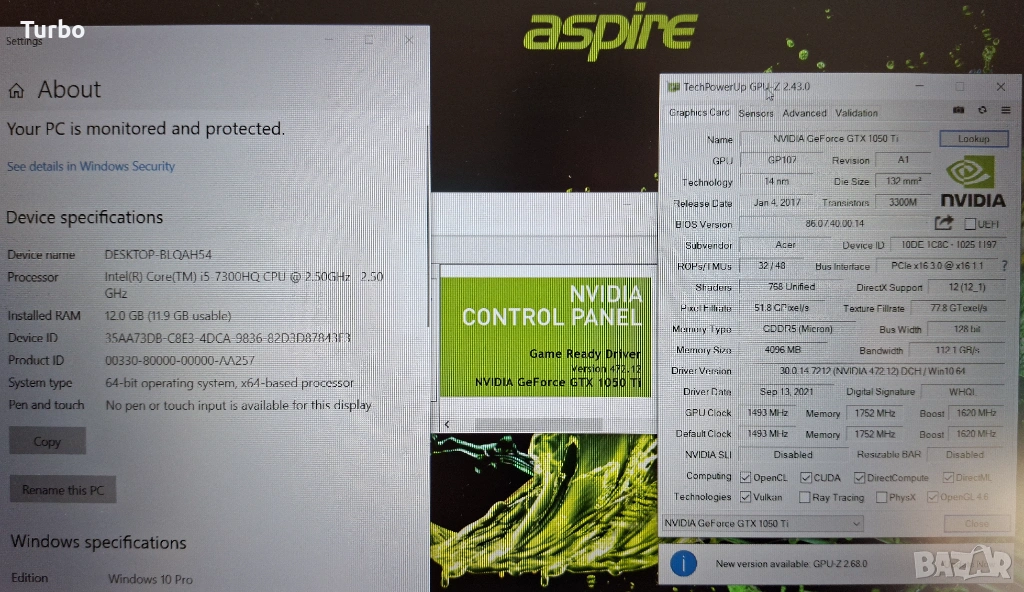 Лаптопът е като нов и е технически безупречен. Качествен геймърски лаптоп от високата серия Aspire 7 на Acer. Разполага с истински четириядрен процесор Intel Core i5-7300HQ и геймърска видеокарта Nvidia GeForce GTX 1050Ti със собствена 4GB GDDR5 памет. Бързо Adata 512GB SSD и 12GB DDR4 рам памет. Дисплеят е IPS, матов, Full HD, има и подсветка на клавиатурата.