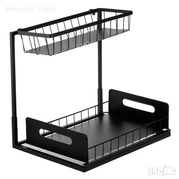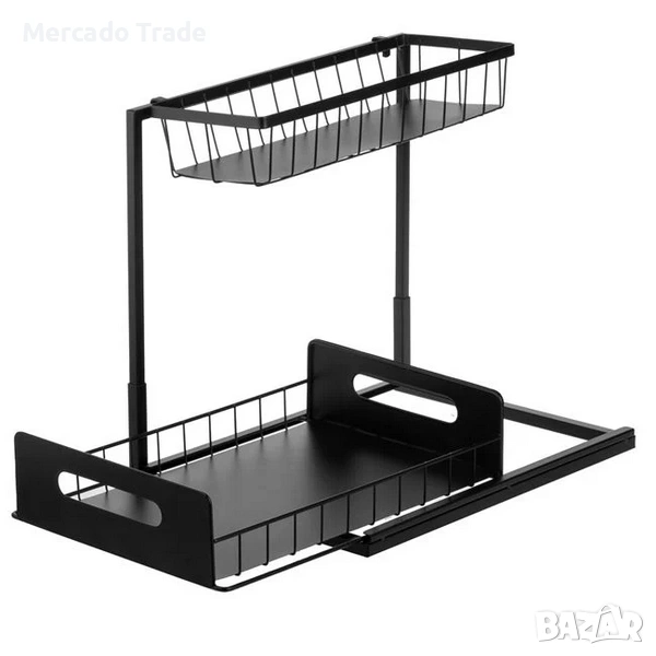 Метална етажерка, подходяща за всяко помещение, шкаф или пространството под мивка. Изработена е от метал в черен цвят, с устойчив корпус, малък горен рафт 33.5x13x6 cm, който е фиксиран, и рафт 35x22.5x4 cm в долната част, който е плъзгащ се за по-лесен достъп до съдържанието. Сглобява се лесно без инструменти и има 4 вендузени крачета за стабилно фиксиране.