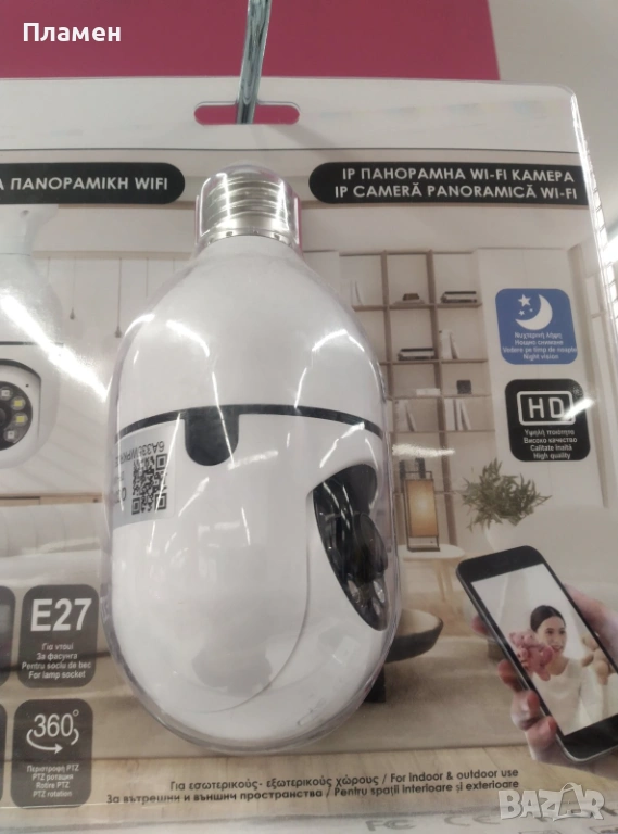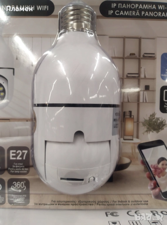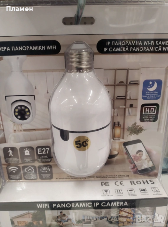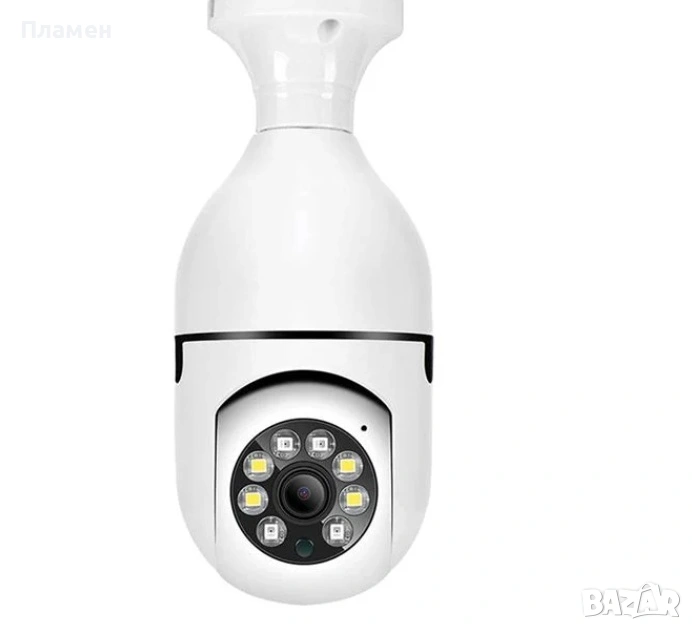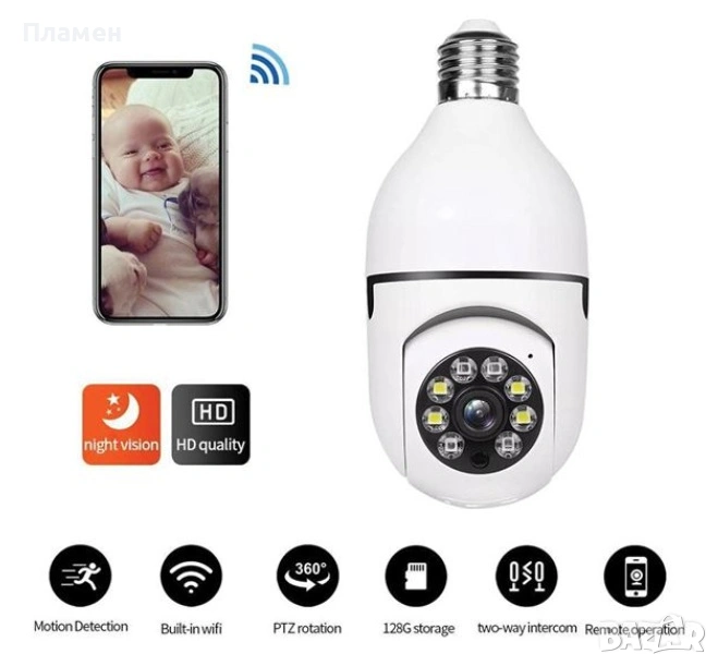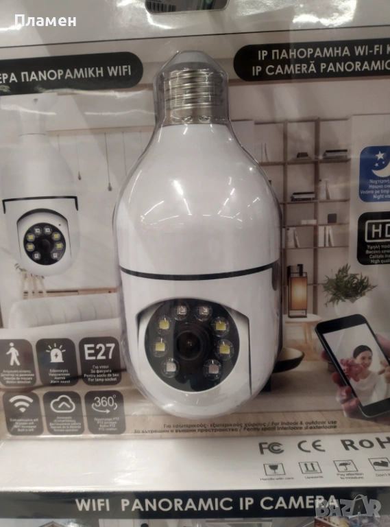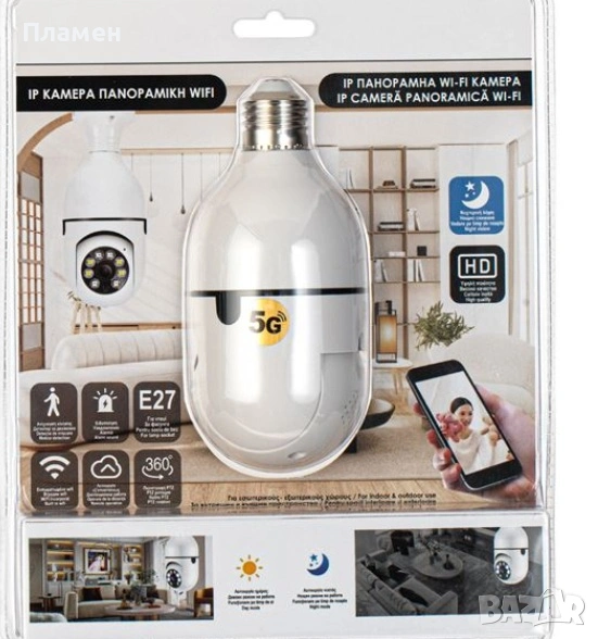Панорамна лампа за WIFI камера за наблюдение с високо HD качество, способна да работи денем и нощем. Има детектор за движение и известяване, с вграден WIFI, дистанционно управление и 360-градусово завъртане. Подходяща е за вътрешни и външни пространства и има E27 цокъл.
