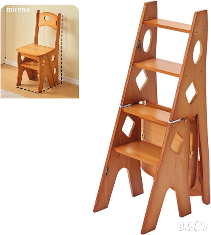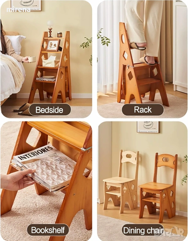 Помощник в живота: Кухненският стол-стъпало може да се използва като стълба, което го прави удобен за достигане до високи предмети, като горни шкафове, смяна на крушки или почистване на прозорци. Може да служи и като декоративна стълба, етажерка за книги, стойка за цветя, библиотечна стълба, кухненски стол, стойка за обувки и рафт.