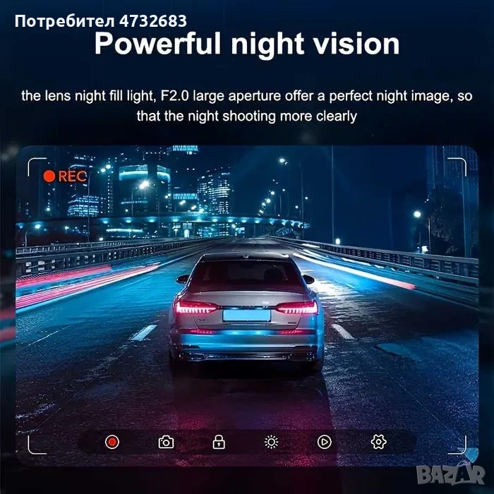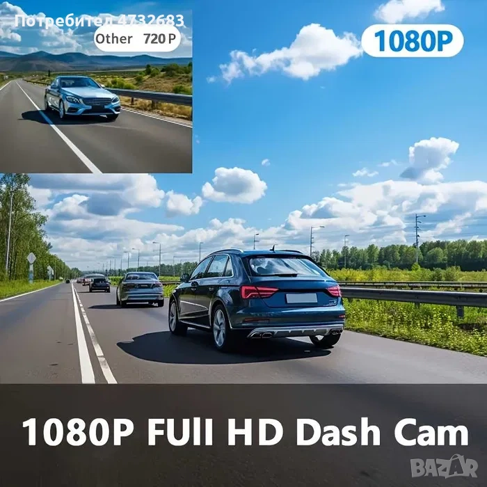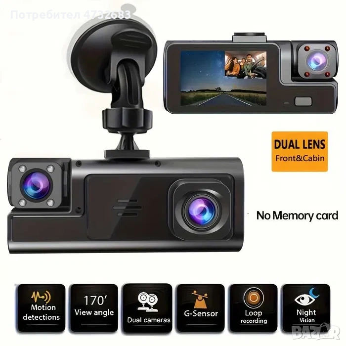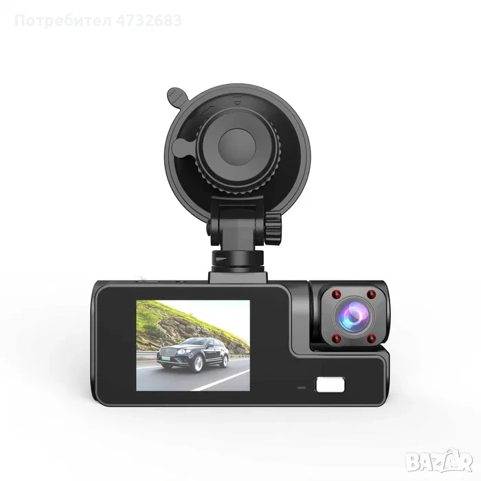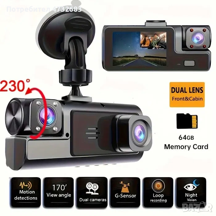 Продавам видеорегистратор с предна и задна камера, подходящ за автомобил. Предната камера записва в Full HD 1080P, а задната – в 720P. В комплекта е включена 32GB SD карта (има опция и без карта).