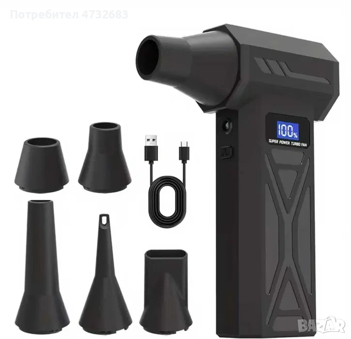 Мощен турбо вентилатор с LED дисплей и обороти до 130000 RPM. Разполага с четири скорости и пет различни накрайника, което го прави идеален за почистване на компютри, клавиатури, автомобили, техника и труднодостъпни места. Работи с презареждаща се батерия и се зарежда чрез USB.