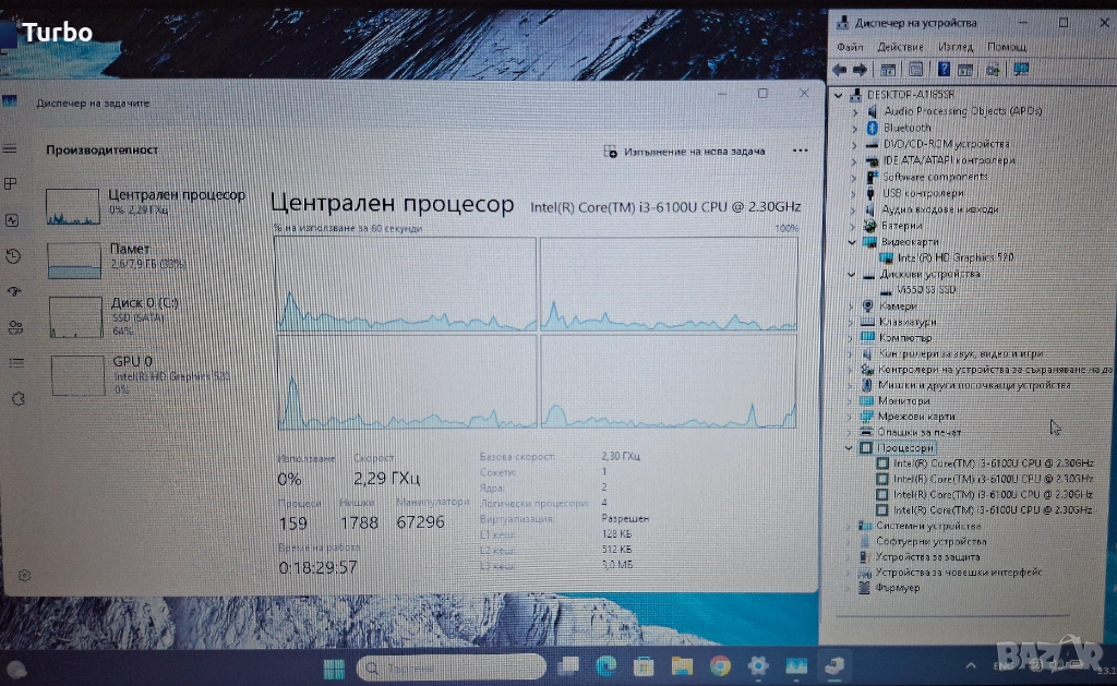 Процесор: Intel Core i3-6100u (2-ядрен, 4-нишков, 4x2.30 – 3MB cache) с Intel HyperThreading