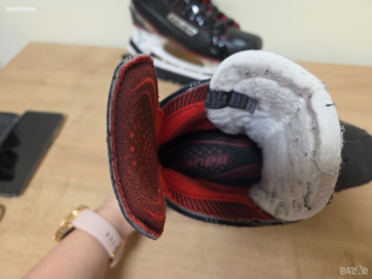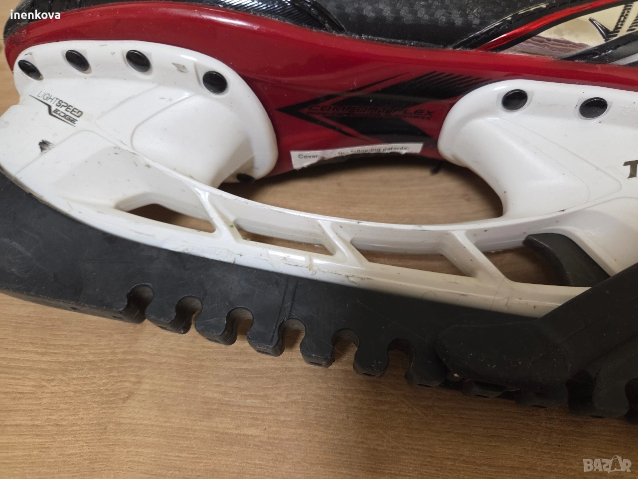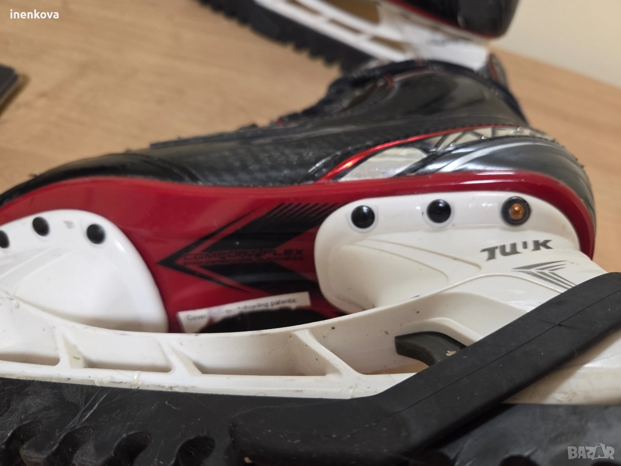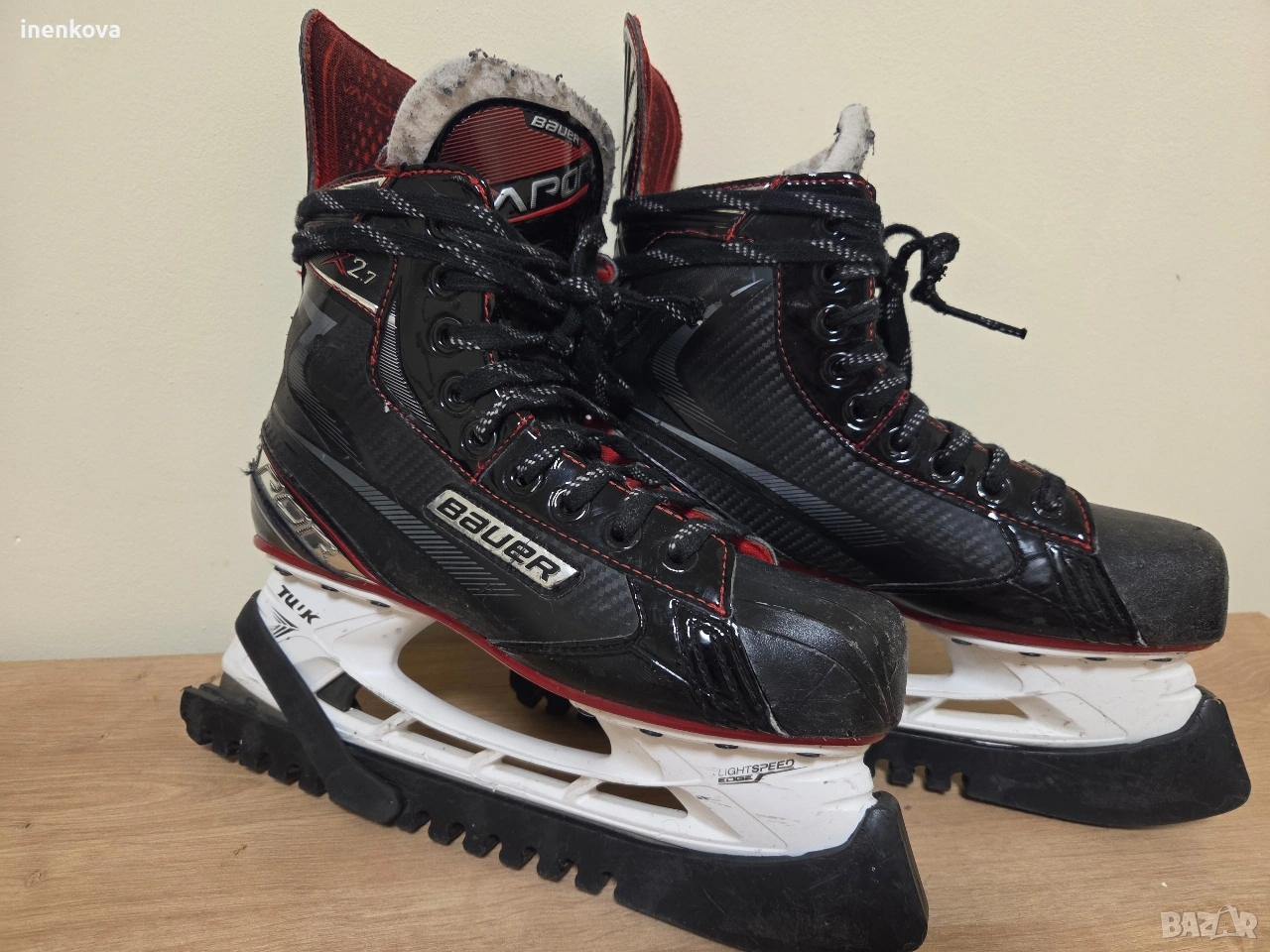 Хокейни кънки Bauer Vapor X2.7 – EUR 39 Продавам оригинални хокейни кънки Bauer Vapor X2.7, размер EUR 39 (US 6.5 / UK 6). Кънките са ползвани много малко – около половин сезон и то нередовно, от дъщеря ми. ✔️ Много добро състояние ✔️ Леки и удобни ✔️ Отлична стабилност на глезена ✔️ Ножовете са в добро състояние ✔️ Включени протектори за ножовете (TUUK) Имат нормални следи от употреба, видими на снимките, които не влияят на функционалността. Цена: 150 € 💬 Възможен разумен коментар 📦 Лично предаване или изпращане с куриер.