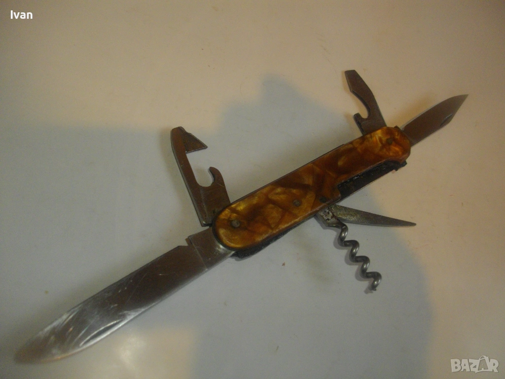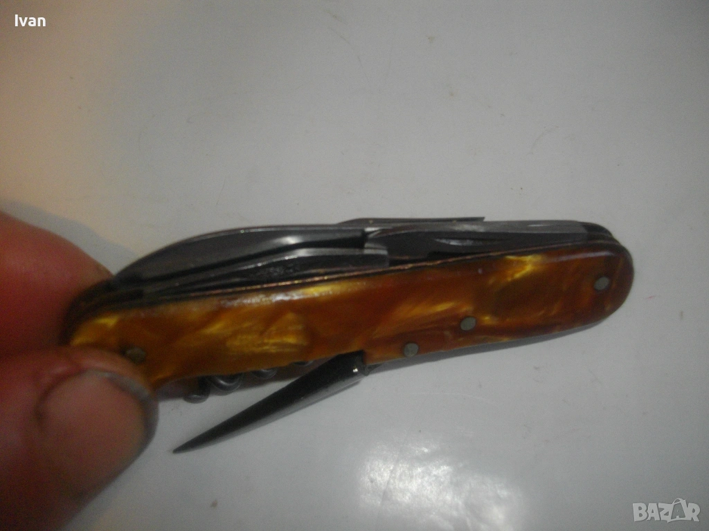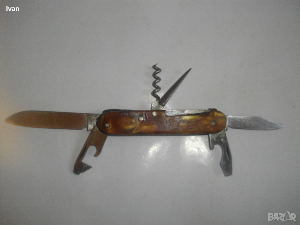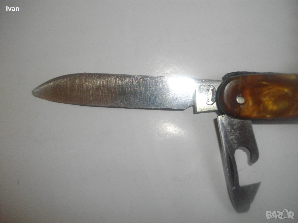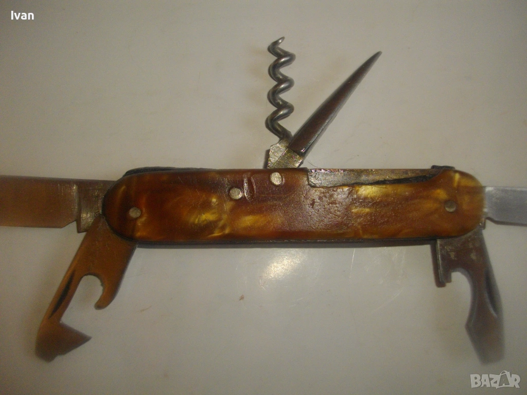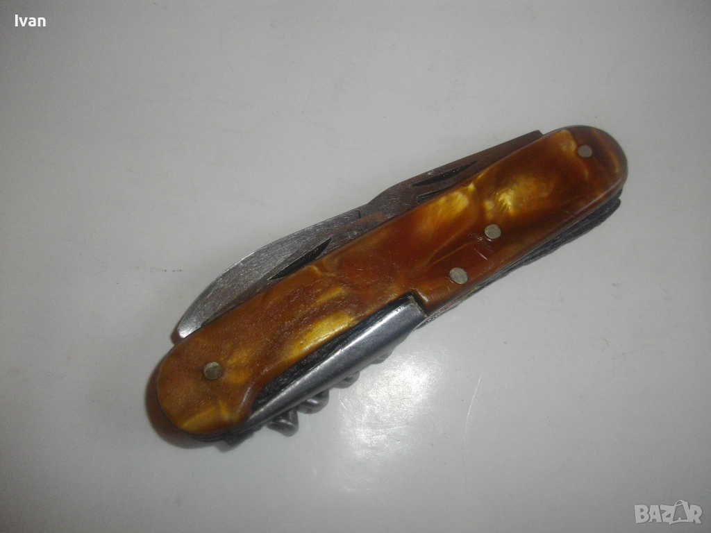 Запазен външен вид, добро работно състояние. Дръжка покритие от каталин, цвят кафяво-жълт.Остриета - дълго 7 см, късо острие 4,5 см, отварачка за консерви и отварачка за капачки, тирбушон и шило пробои. Всички остриета са от неръждавейка с лого за неръждавейка на основното острие. Дължина на ножката в затворено състояние - 9 см.