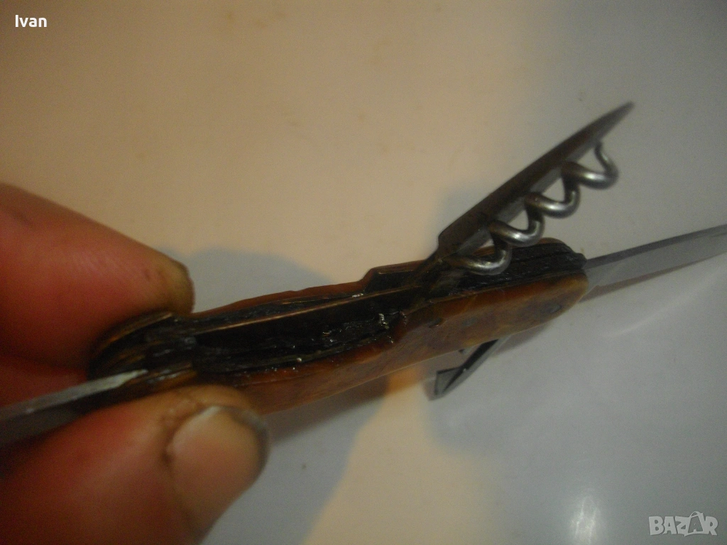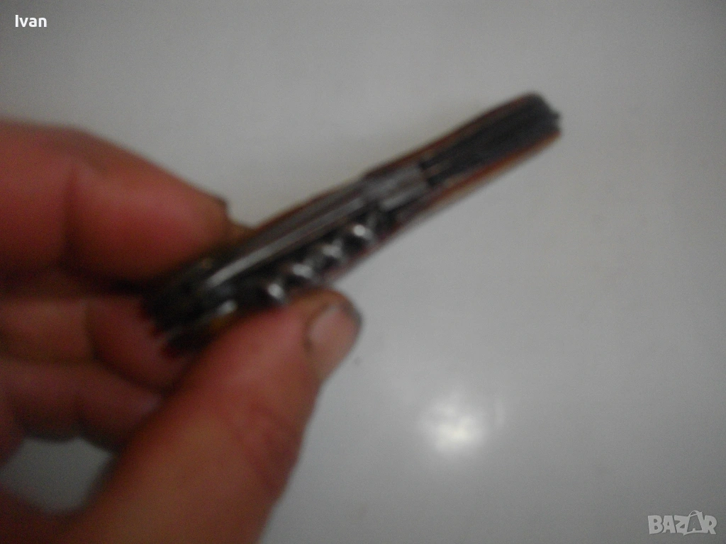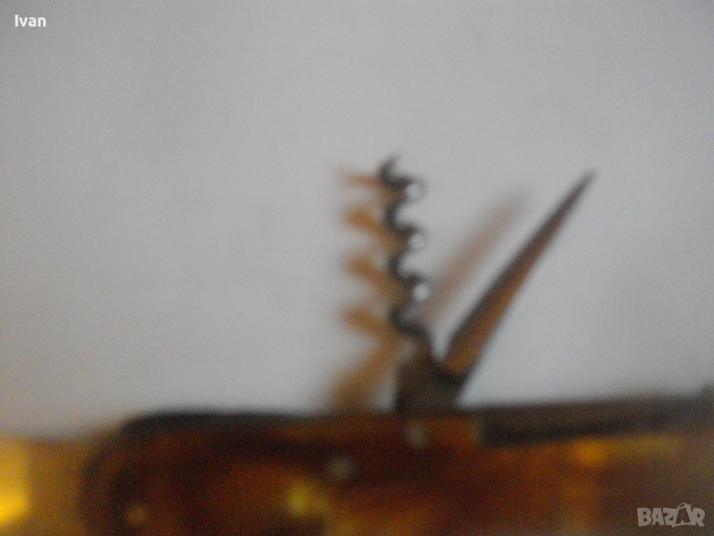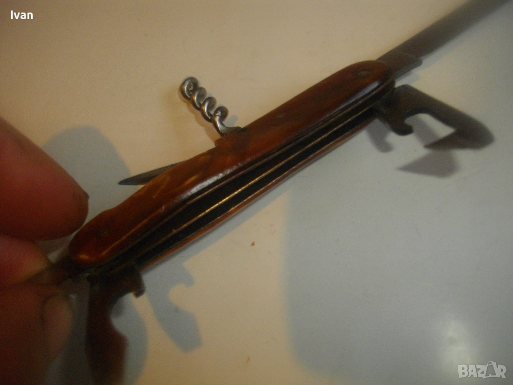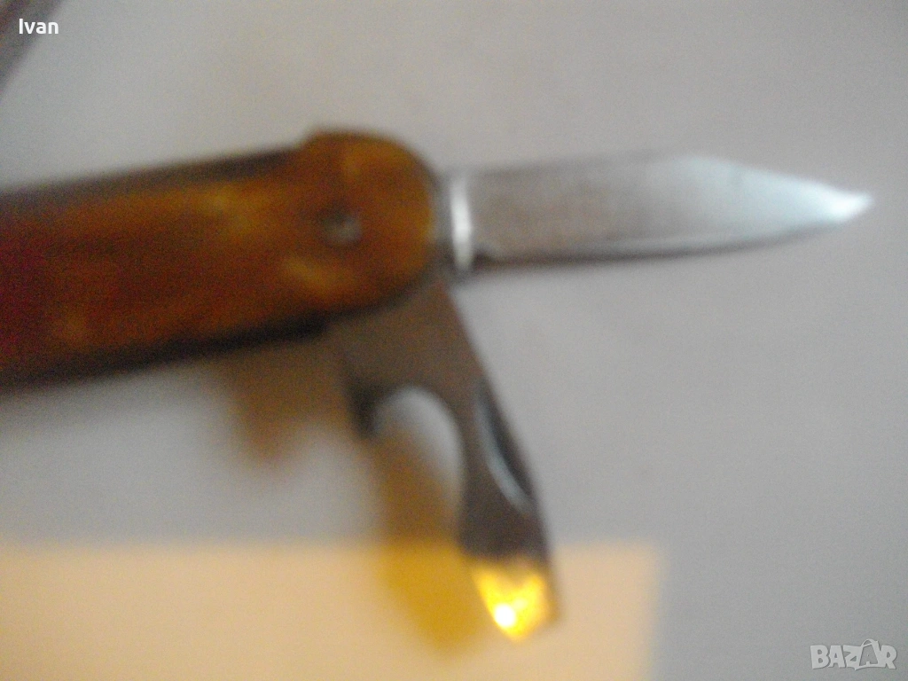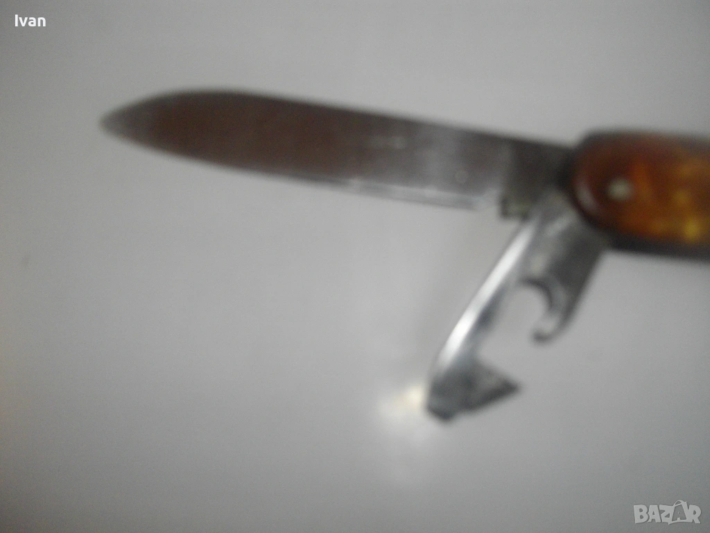 Запазен външен вид, добро работно състояние. Дръжка покритие от каталин, цвят кафяво-жълт.Остриета - дълго 7 см, късо острие 4,5 см, отварачка за консерви и отварачка за капачки, тирбушон и шило пробои. Всички остриета са от неръждавейка с лого за неръждавейка на основното острие. Дължина на ножката в затворено състояние - 9 см.
