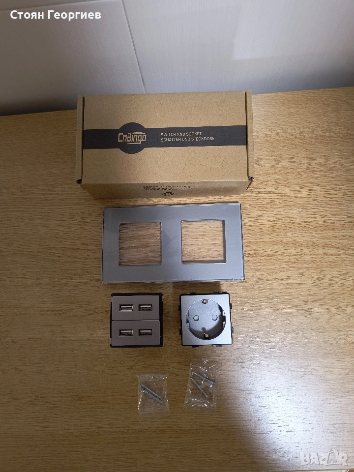 CNBINGO Стъклен вграден единичен Schuko контакт с 4 USB порта 2.4A със стъклена рамка, сив Спецификации: Щепсел Schuko с детска защита, поддържа AC 16A 250V макс. Входно напрежение на USB порта: 100V - 250V AC, 50/60Hz, USB изход: DC 5V/2.4A. Сертифициран по CE / RoHS
