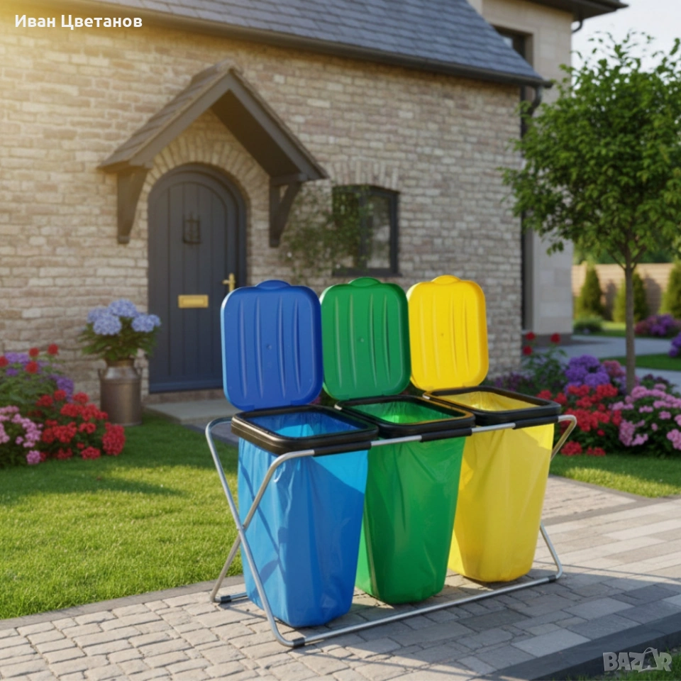 Система: три отделения с цветна маркировка — пластмаса (жълто), хартия (синьо), стъкло (зелено).
