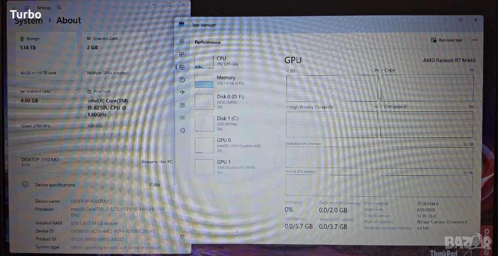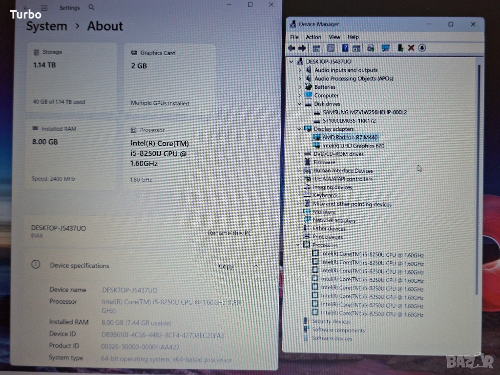 Лаптопът е като нов и е технически безупречен. Висококачествен лаптоп от серията IdeaPad V330 на Lenovo. Разполага с истински четириядрен Intel Core i5-8250U процесор с 8-хипер ядра и видеокарта AMD Radeon R7 440 с 2GB GDDR5 собствена памет. Има и светкавично 256GB SSD и 1000GB хард диск. Има и бърза 8GB DDR4 РАМ памет.
